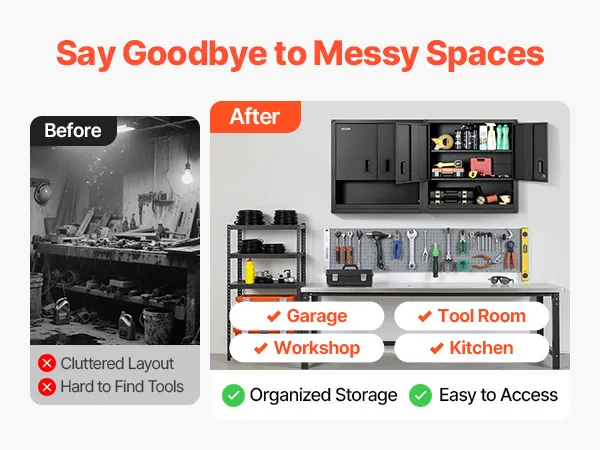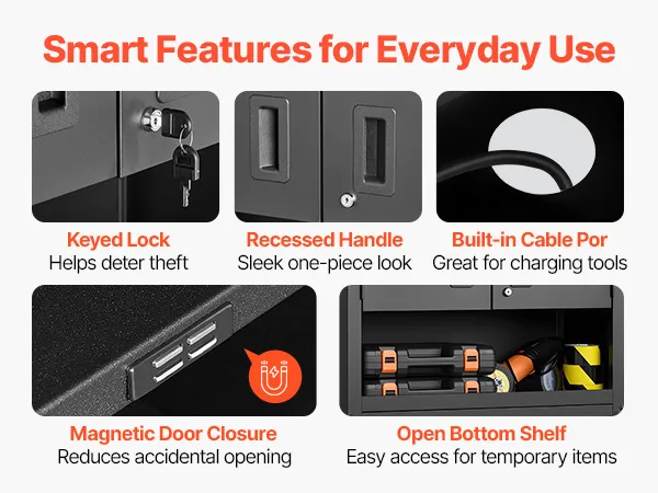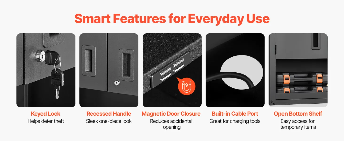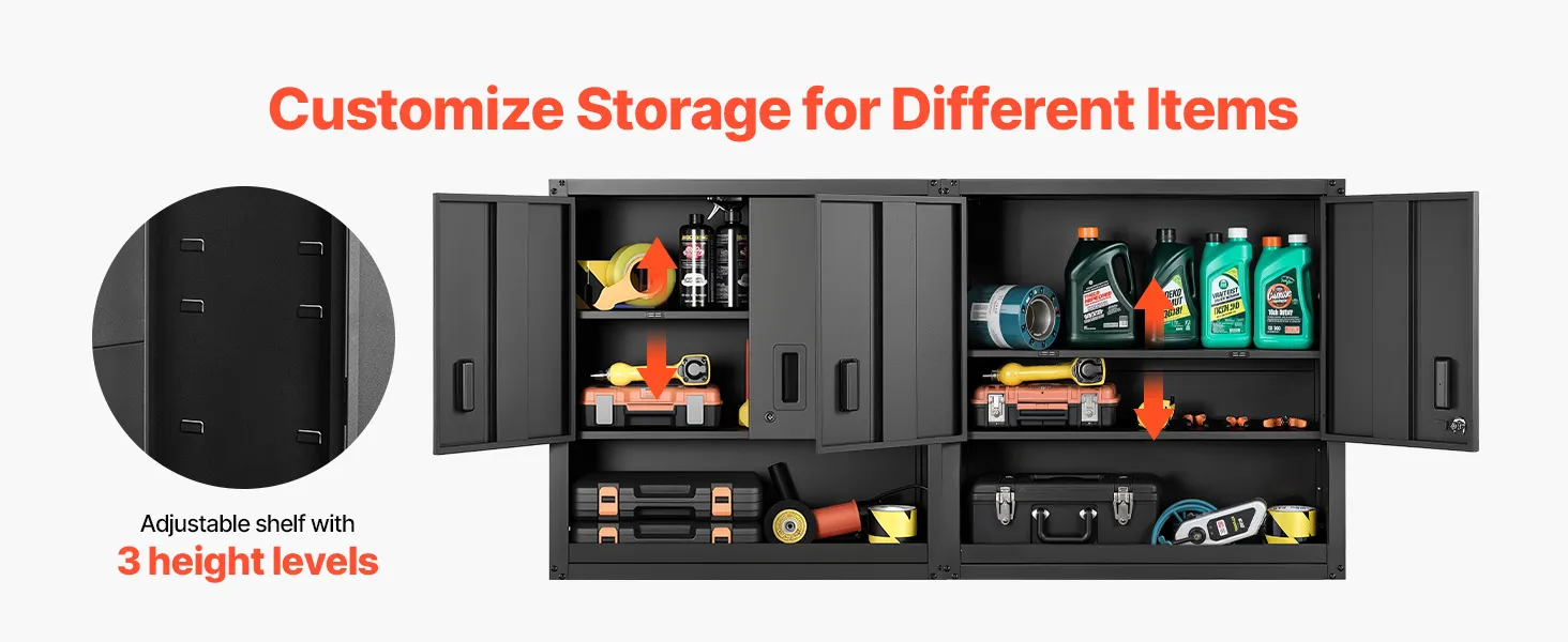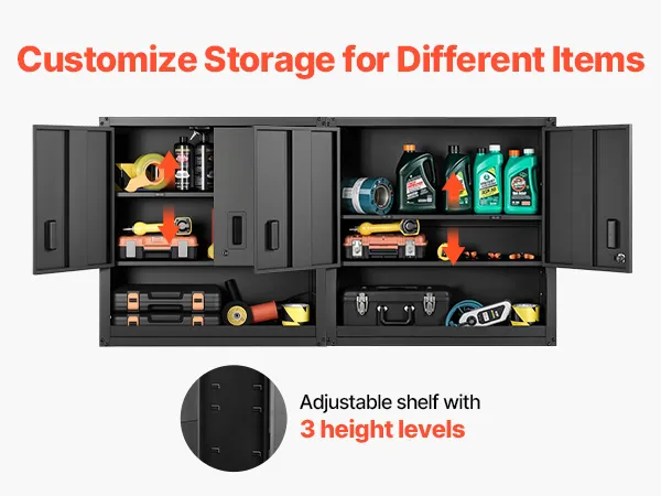 • Easy Access Doors: Dual side-opening doors open smoothly for quick access. A lock of the floating garage tool cabinet keeps items secure, while magnetic closures keep doors tightly shut for reliable use