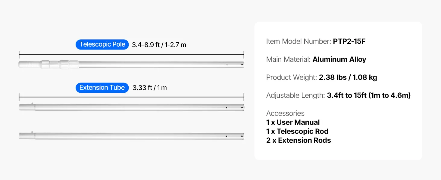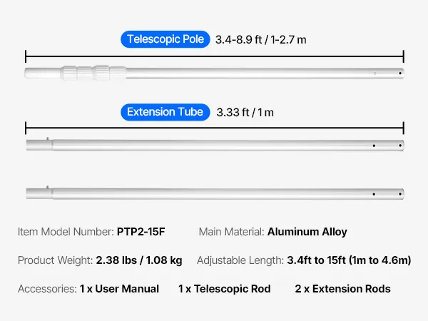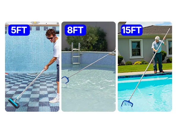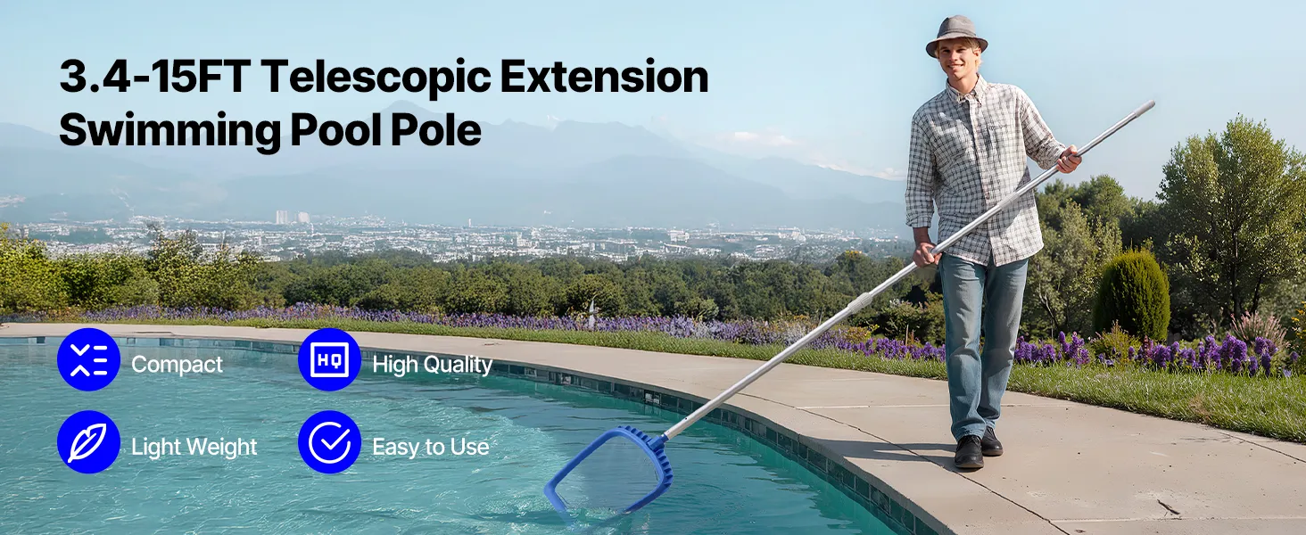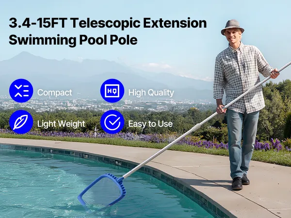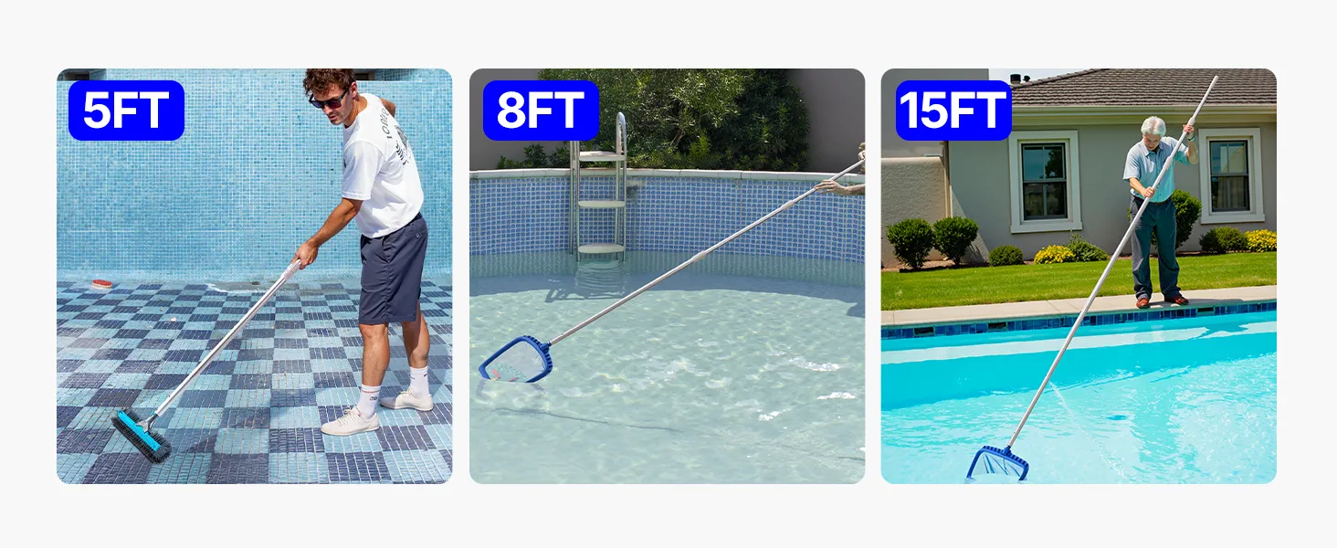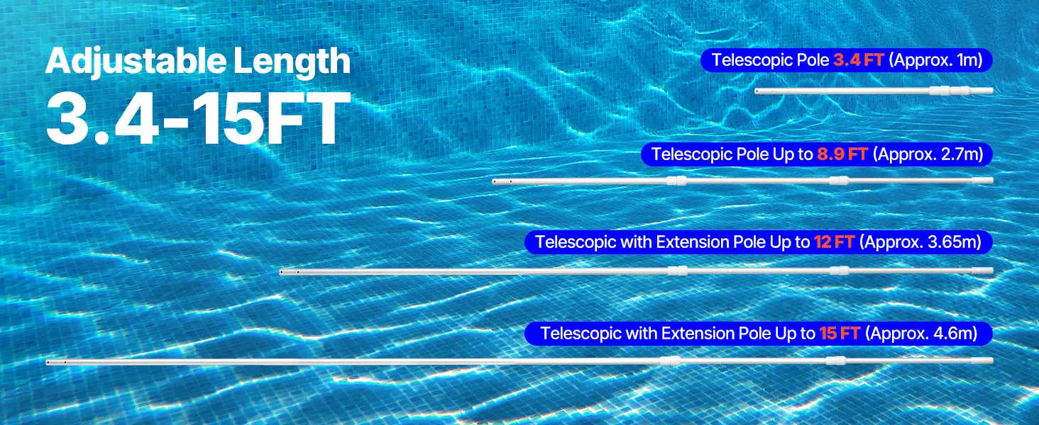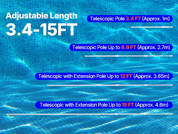 • Adjustable Length: This pool pole extends from 3.4 ft to 15 ft (approx. 1 to 4.6 m), ideal for cleaning both shallow and deep areas. One pole for multiple uses