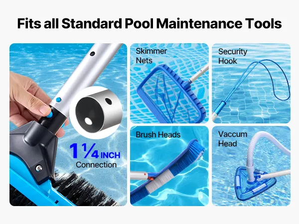 • Standard Connector Size: The end of our telescoping pool pole uses a standard 1¼ inch design, compatible with most pool cleaning tools like skimmer nets, brushes, and vacuum heads—no need to change poles frequently