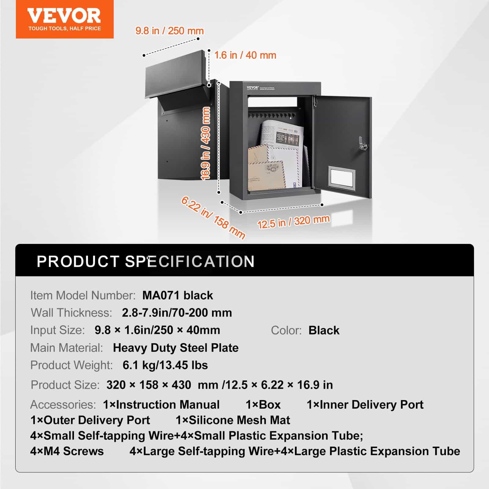 VEVOR Through The Wall Drop Box 31.8x16x42.9 cm Mailbox with Code Lock Black
