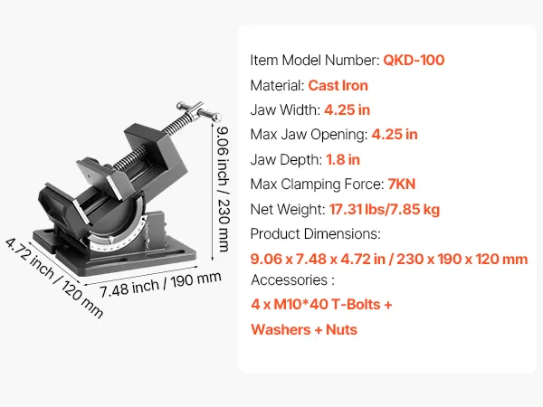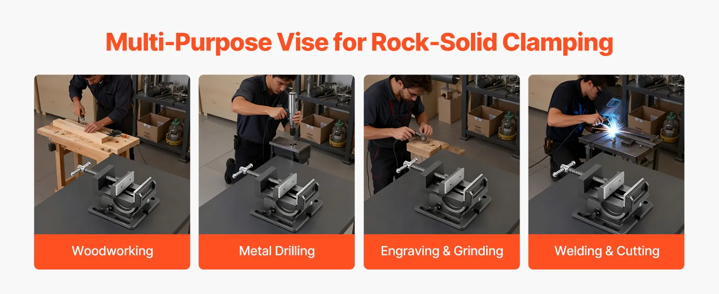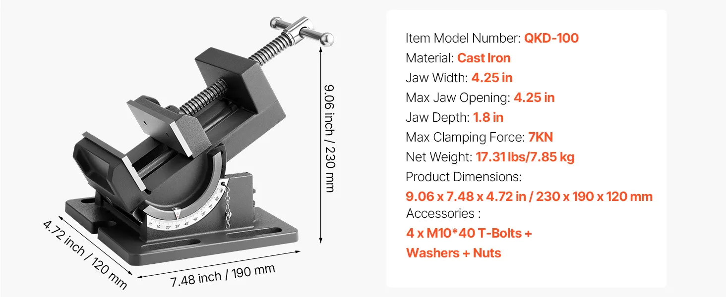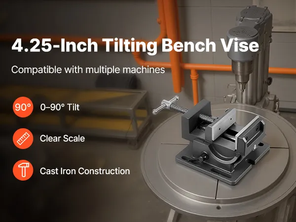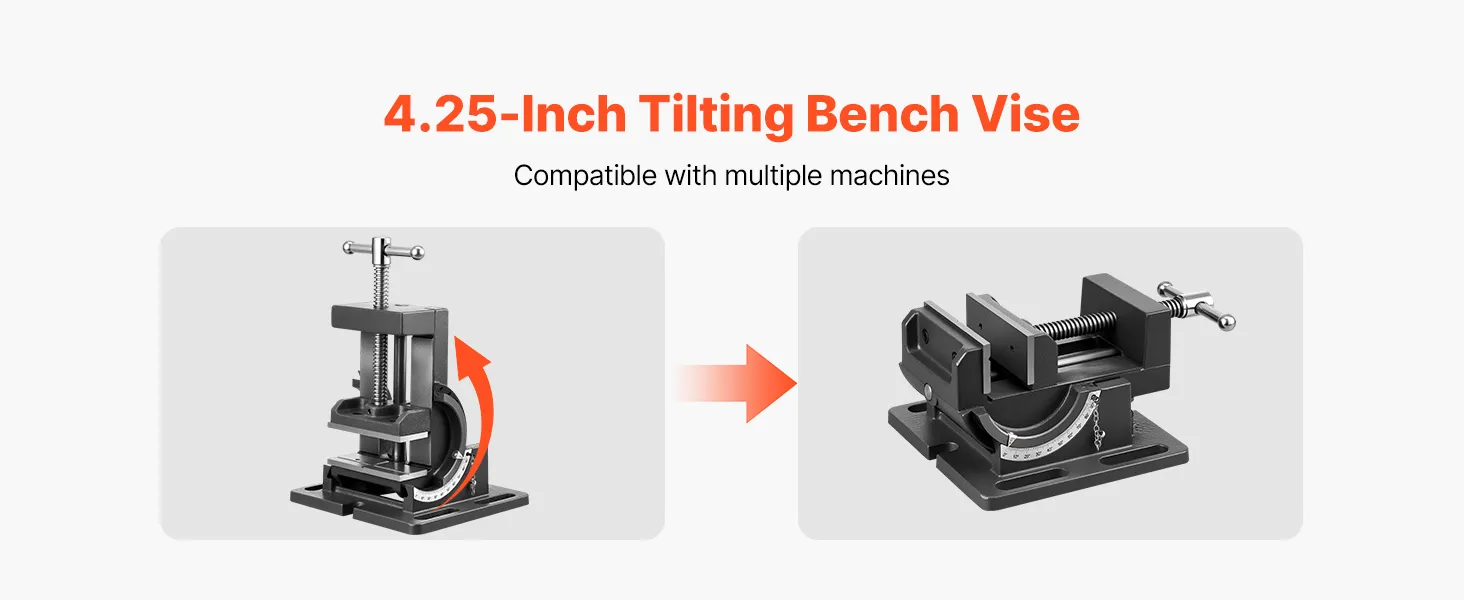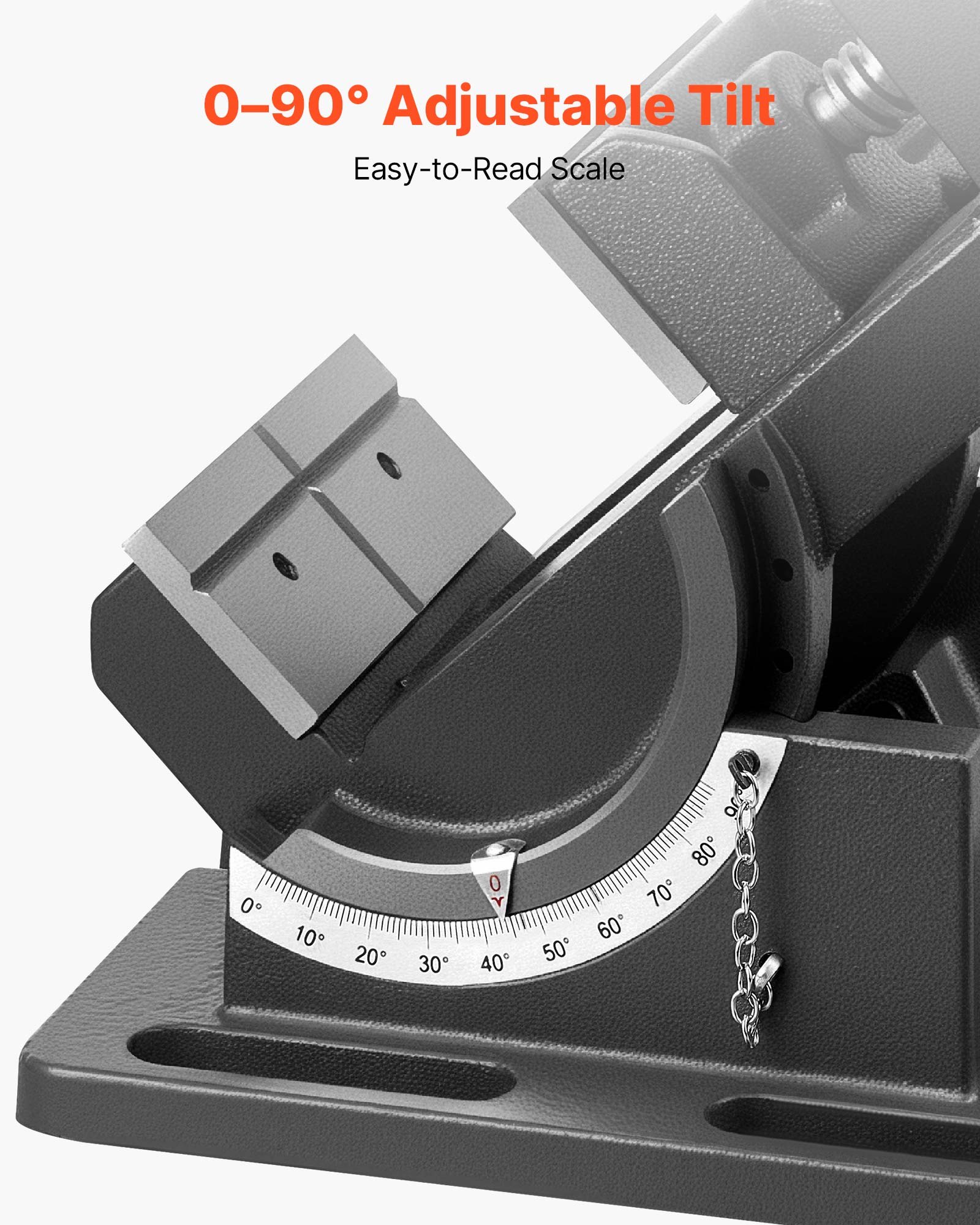Built from high-strength cast iron, this tilting vise features a clear scale for accurate angle adjustment. It supports 0-90° tilt operation, ideal for milling machines, drill presses, and more.