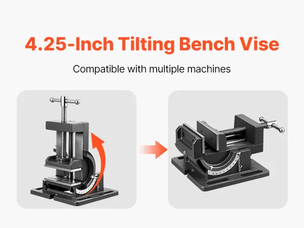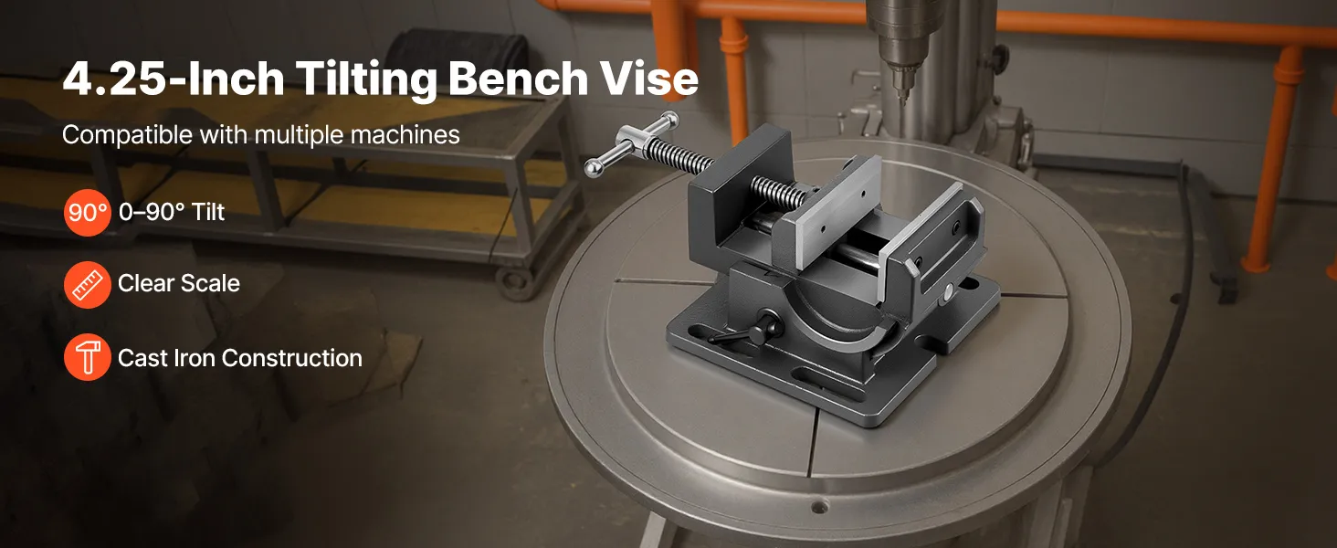 VEVOR Tilting Vise, 4.25 Inch Jaw Width, Portable Drill Press Bench Vise, 0–90° Adjustable Tilt, Durable Cast Iron Construction, Workbench Vice for Woodworking, for Benchtops and Drill Presses, Black