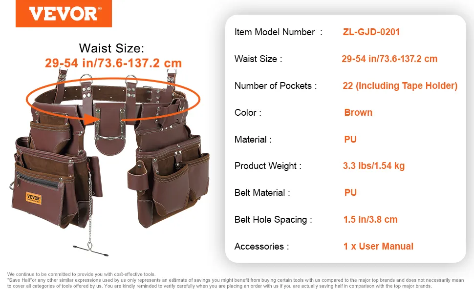 VEVOR Tool Belt, 22 Pockets, Adjust from 29 Inches to 54 Inches, Premium PU Heavy Duty Tool Pouch Bag, Detachable Tool Bag for Electrician, Carpenter, Handyman, Woodworker, Construction, Framer, Brown