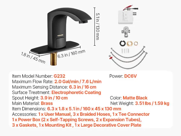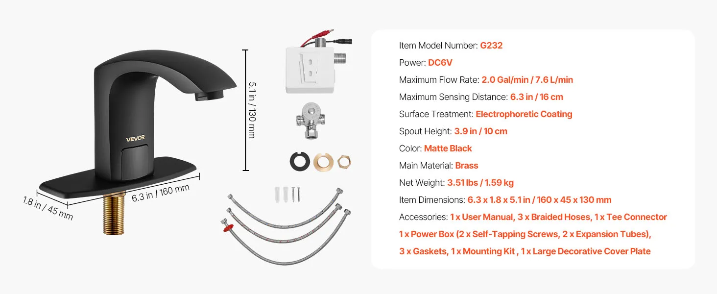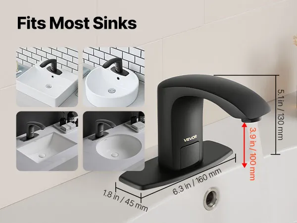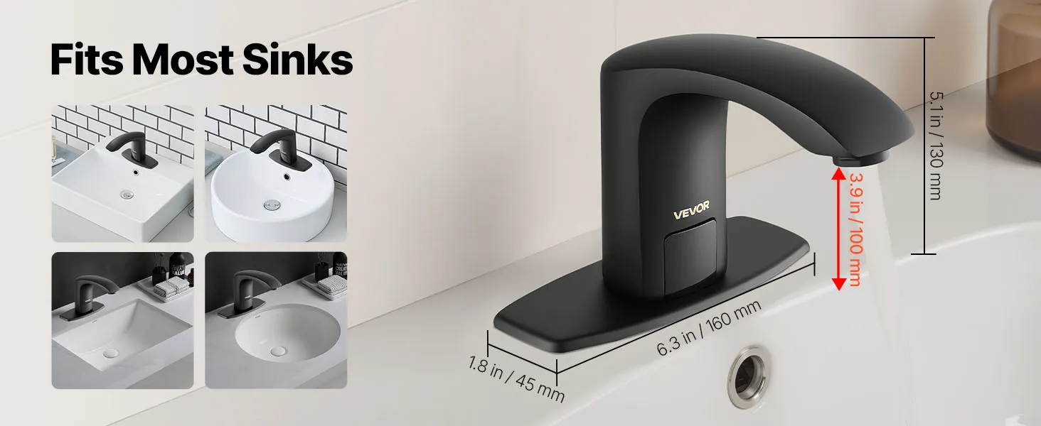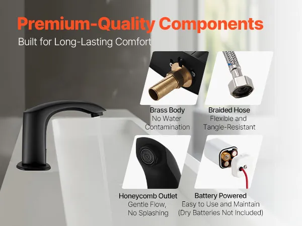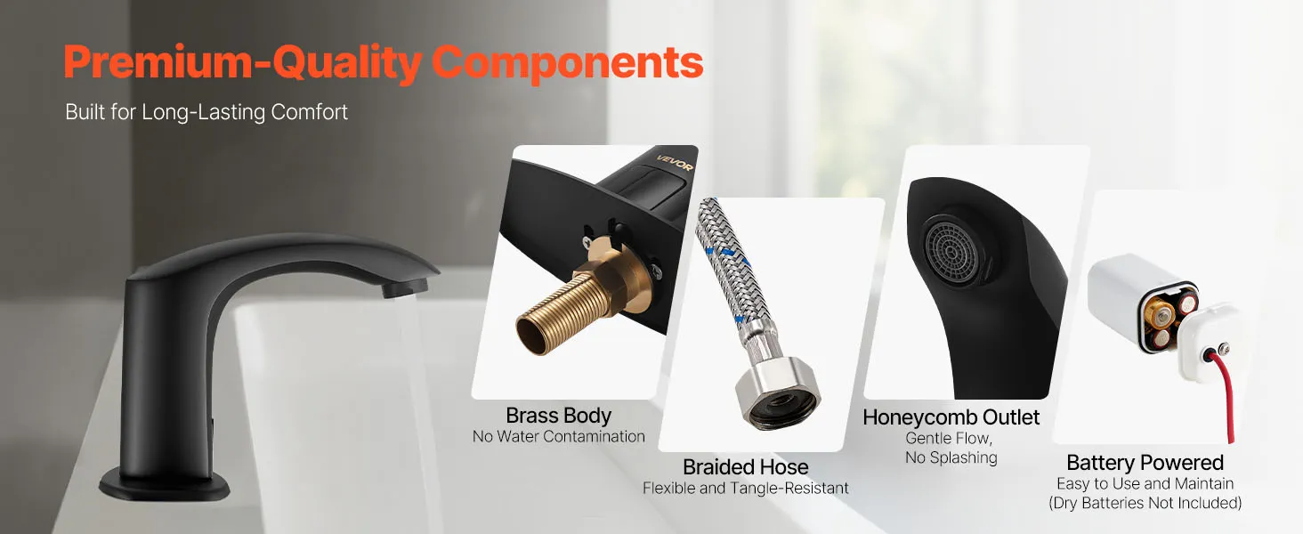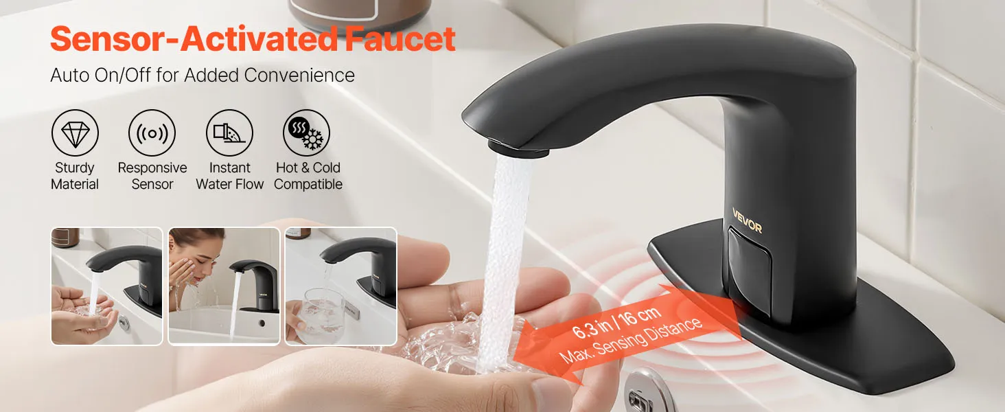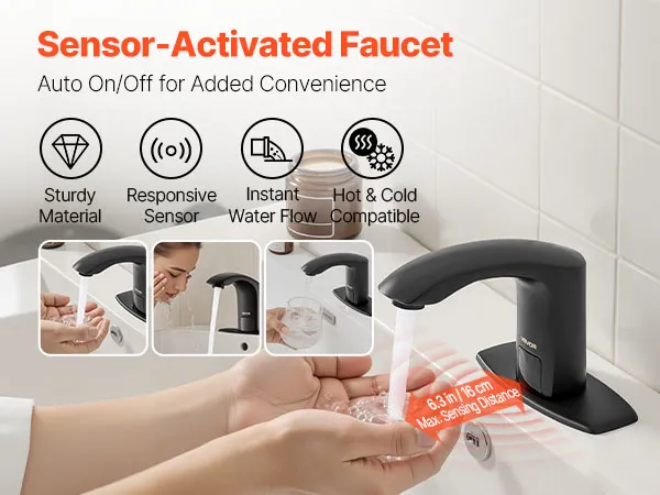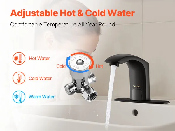 VEVOR Touchless Bathroom Sink Faucet, Automatic Motion Sensor Restroom Toilet Faucet with Hole Cover Plate, Battery Operated,Adjustable Temperature for 9.5 mm Pipe Commercial Lavatory,Matte Black
