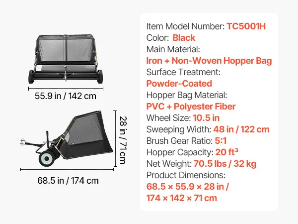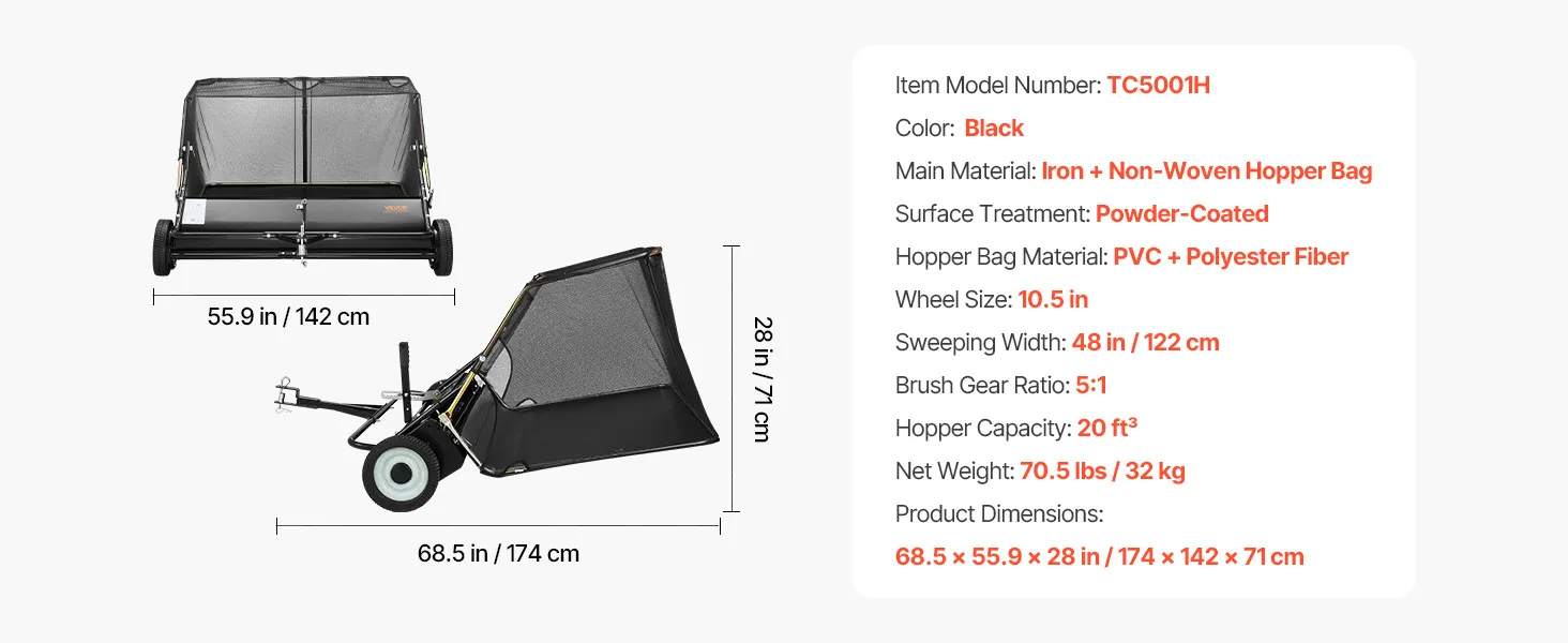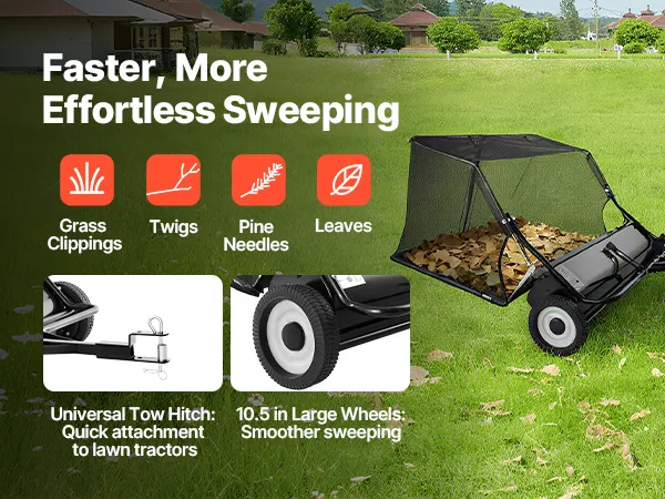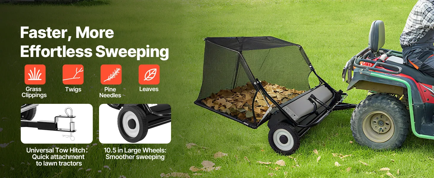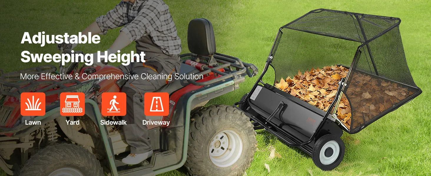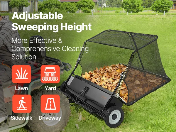 VEVOR Tow Behind Lawn Sweeper, 122cm Pull Behind Yard Sweeper, 26 cu. ft Hopper Bag Capacity, Leaf & Grass Collector with Dumping Rope, Adjustable Sweeping Height, Garden Sweepers for Lawn Farm