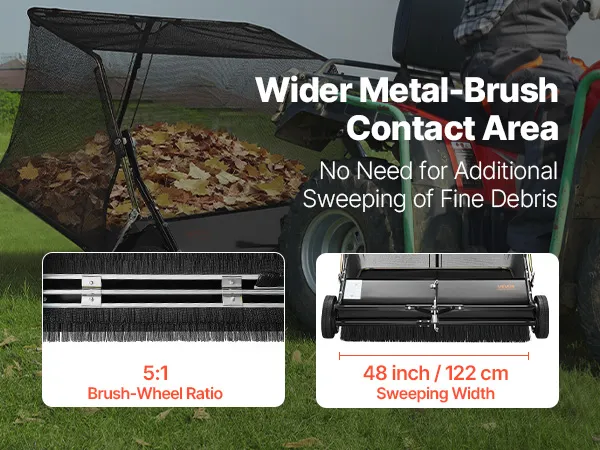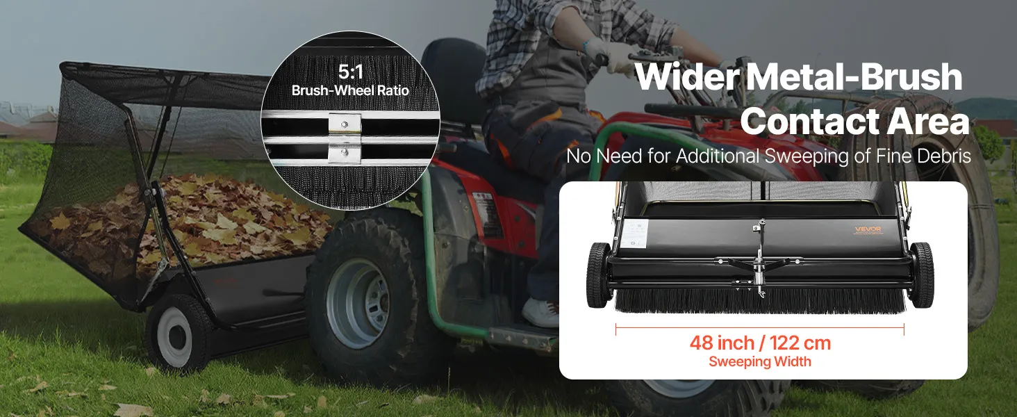 The garden sweeper with widened metal-to-brush contact strengthens sweeping performance, ensuring thorough cleanup of dry leaves and yard debris. With a sweeping width of 48 in / 122 cm, you can cover larger areas in a single pass, quickly handling even heavy leaf fall.
