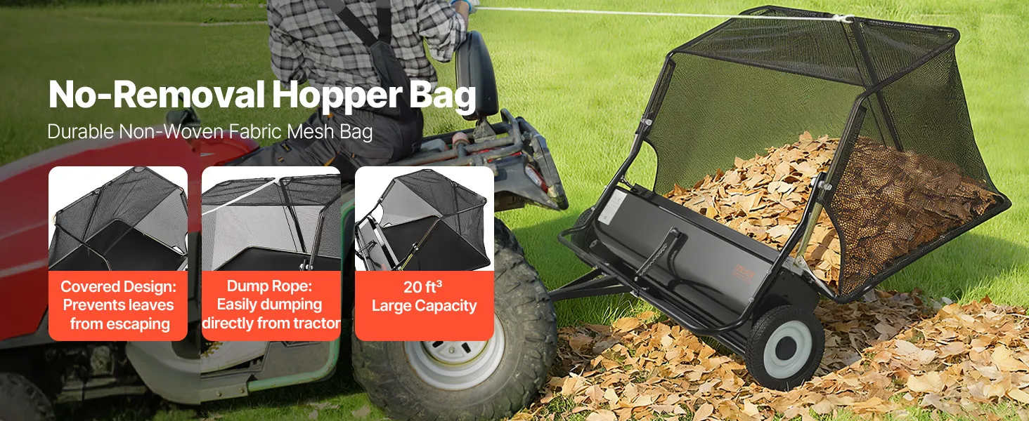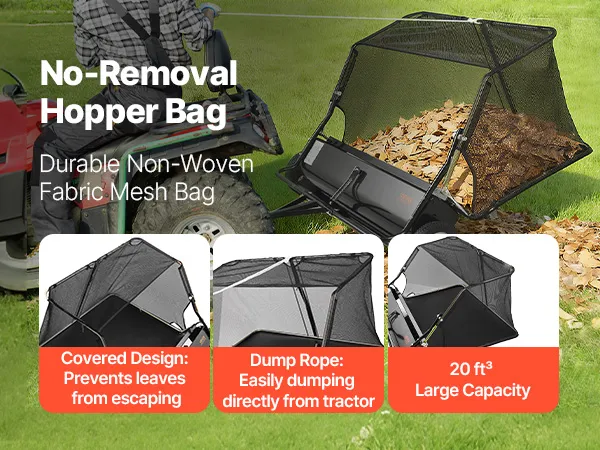 The leaf sweeper comes with a 20 ft³ non-woven fabric bag allows you to collect more leaves, grass, and debris at once. The cover avoids leaves from blowing out in windy conditions, and the convenient dump rope lets you empty the bag directly from your tractor—no need to remove it.