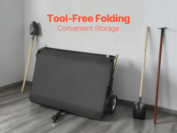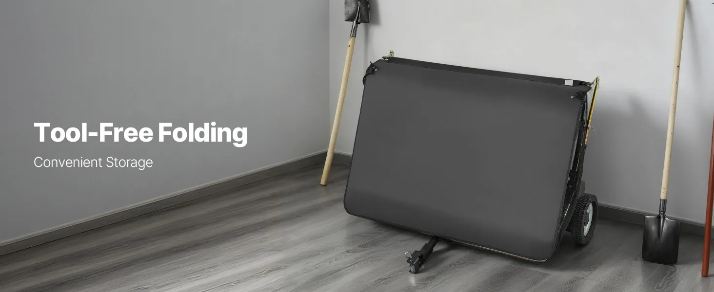The yard sweeper folds for compact storage. After cleaning your yard, it can be stored in a shed or hung on a garage wall without taking up much space.