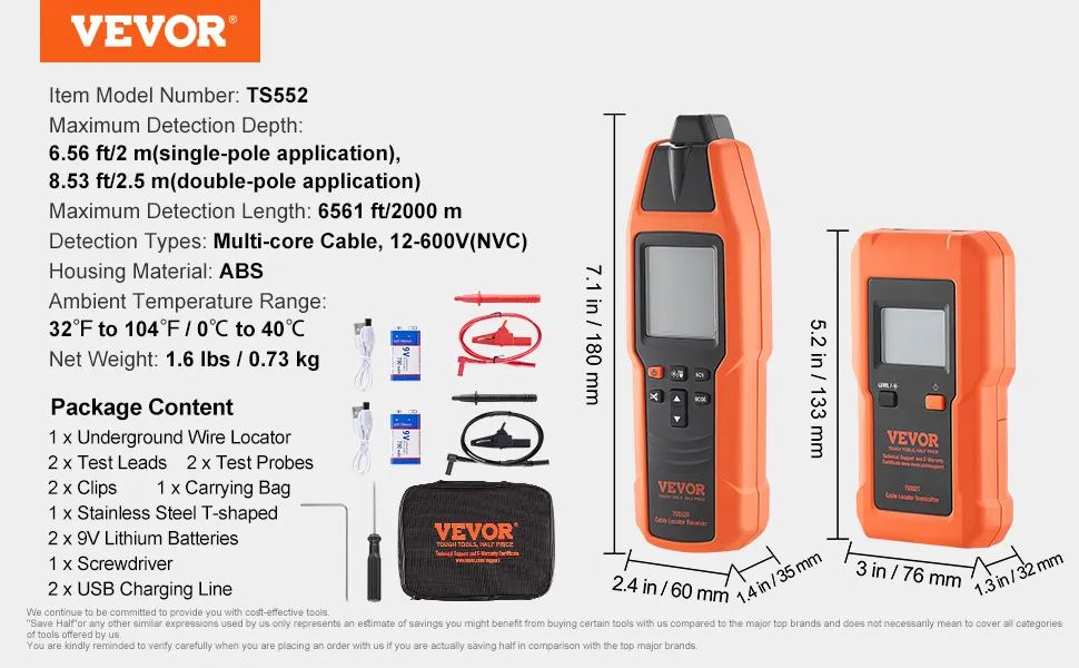 VEVOR Subterranean Wire Tracker, Up to 3 FT Detection Depth, Voltage Range 12-600V, Circuit and Line Break Locator, Extends to 6561 FT for Underground Pipes, Electric Fencing, Hidden Wires