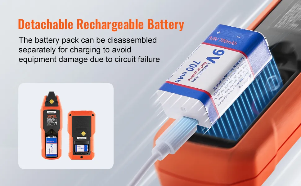 Equipped with two rechargeable 9V batteries, our underground wire locator ensures continuous operation. You can also conveniently recharge them externally without any concerns about battery life. Say goodbye to battery anxiety and stay powered up for all your cable-locating needs.