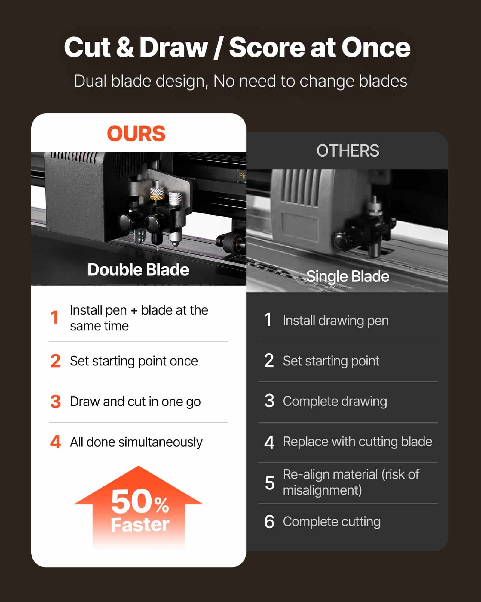 • Dual-Blade Design: Our vinyl plotter cutter is equipped with main and auxiliary blades for simultaneous drawing + cutting or scoring. No manual blade swaps needed. One setup completes multiple operations, greatly improving efficiency