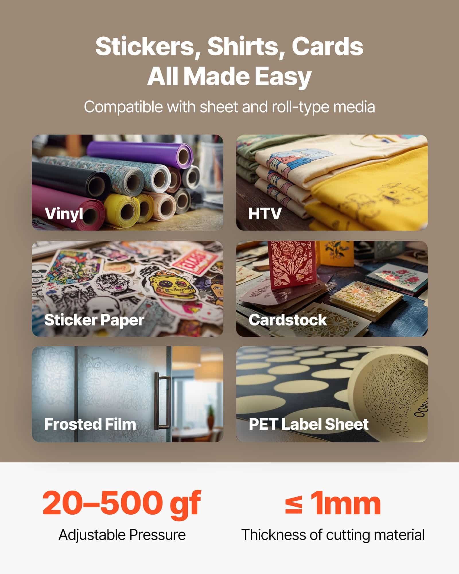 • Material Versatility: This vinyl plotter works with sheets and rolls up to 1 mm thick, with 20–500 gf adjustable force. It easily handles vinyl, HTV, adhesive vinyl, magnetic sheets, sticker paper, car decals, and more for DIY or commercial projects