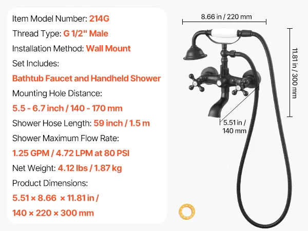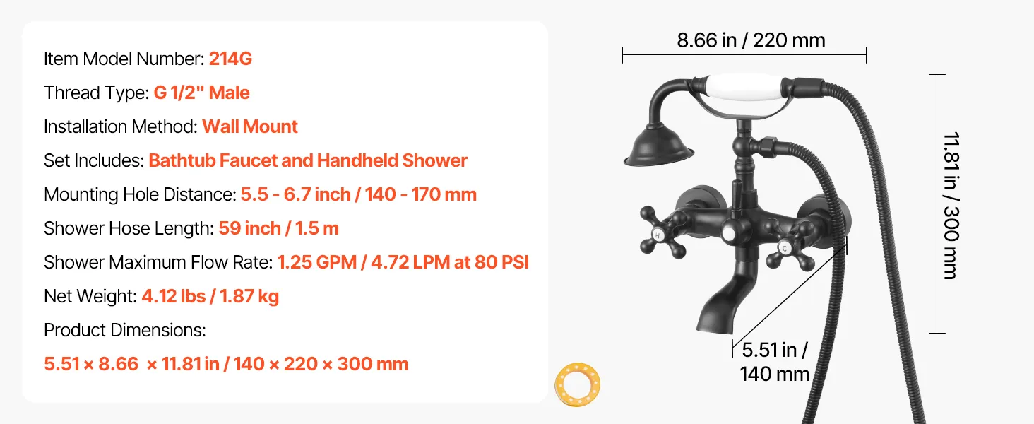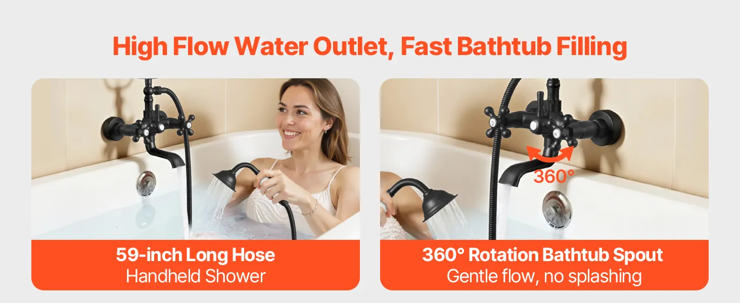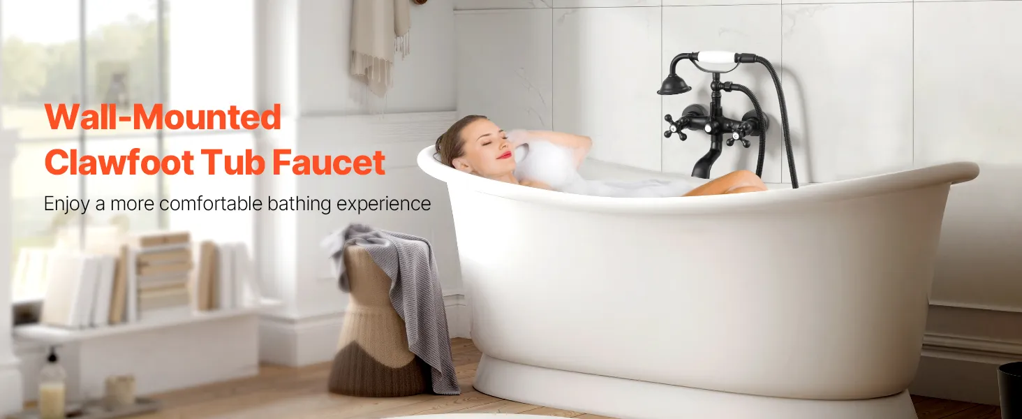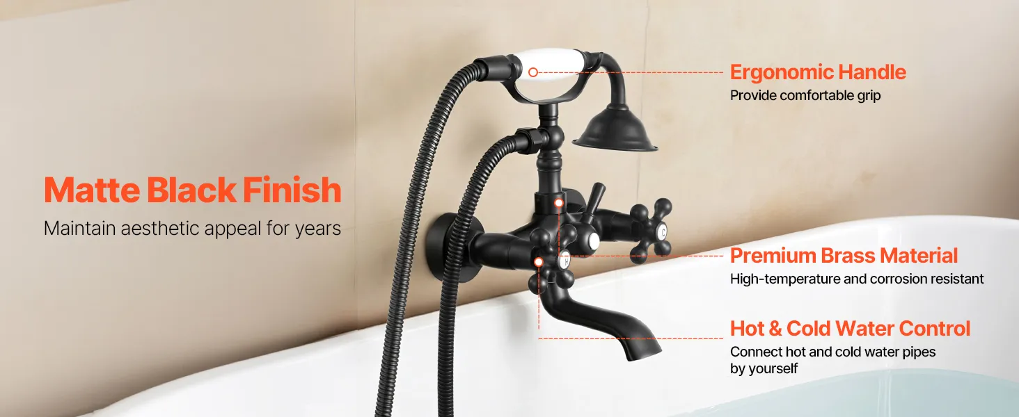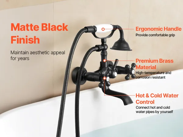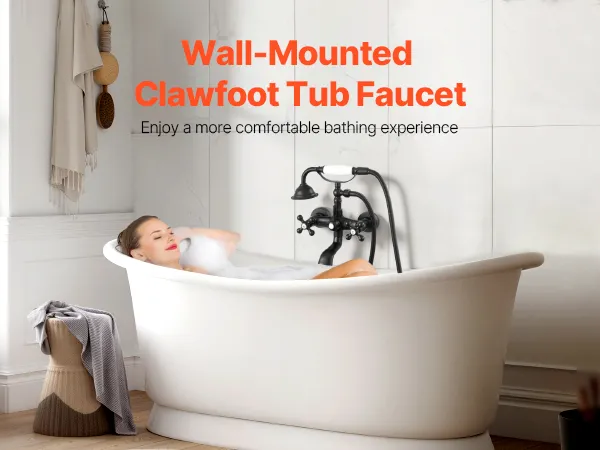 Enhance bathing comfort while elevating your bathroom style with VEVOR clawfoot tub faucet. Crafted from solid brass with a matte black finish, it resists corrosion and fading for lasting durability. Smooth water flow and flexible hot/cold water control make every bath more enjoyable.