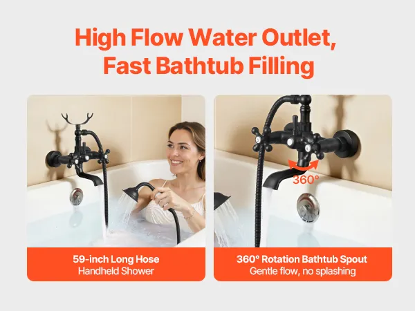 This bathtub faucet with handheld shower delivers high flow water output, filling your bathtub faster while offering a fuller, more comfortable shower experience. You can freely switch between the handheld shower and the rotatable tub spout.