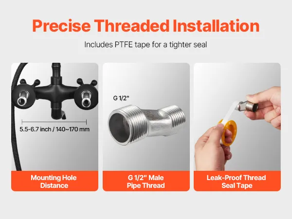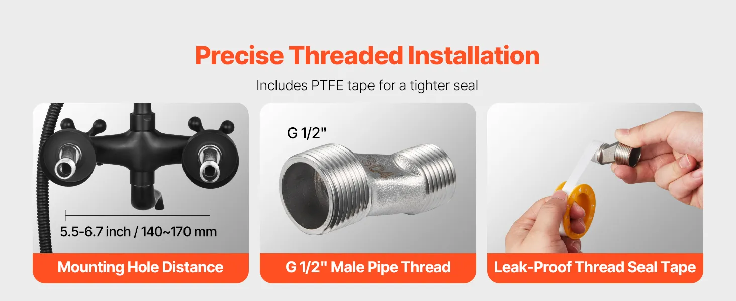 Precise threaded design with included PTFE tape ensures a tighter, leak-proof seal. Easy to install with G 1/2" male pipe thread and adjustable swing arms that provide 5.5–6.7 inch (140-170 mm) mounting hole center distances.