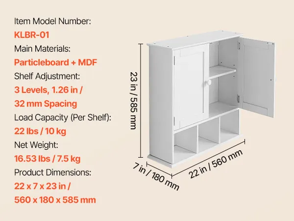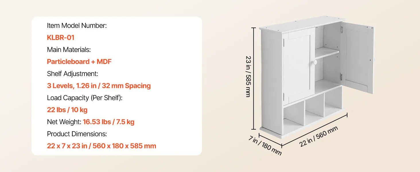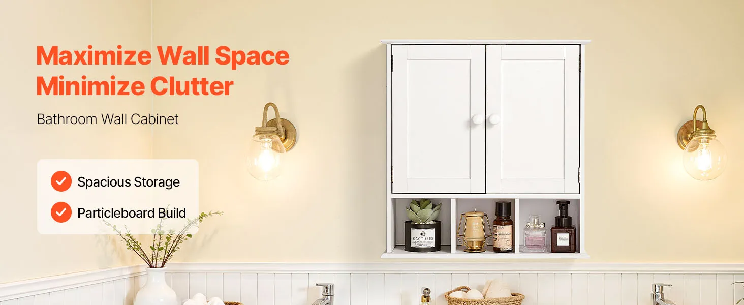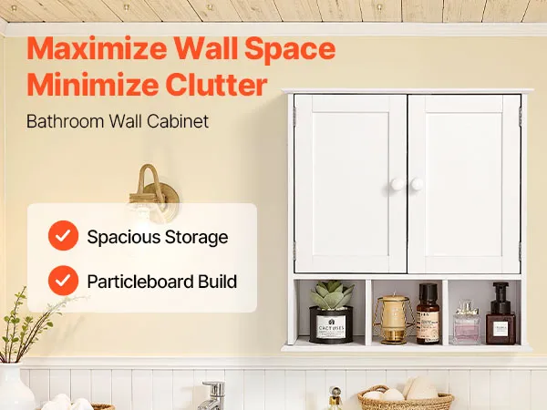 This bathroom wall cabinet features premium particleboard, sturdy, durable, and appealing. Its spacious interior with 3-level adjustable shelf maximizes vertical storage. Our bathroom wall cabinet meets the storage needs of various toiletries and miscellaneous items.