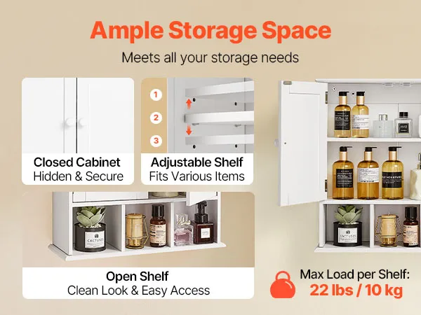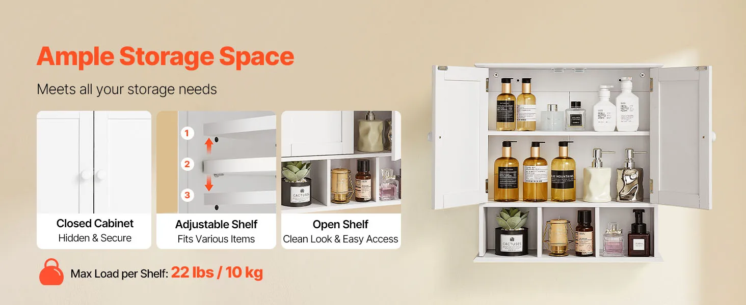 The enclosed cabinet provides hidden, secure storage for items. The hanging bathroom cabinet’s adjustable shelf can flexibly adapt to various types of items and the open shelf is neat and beautiful to access daily items. It is sturdy and durable.