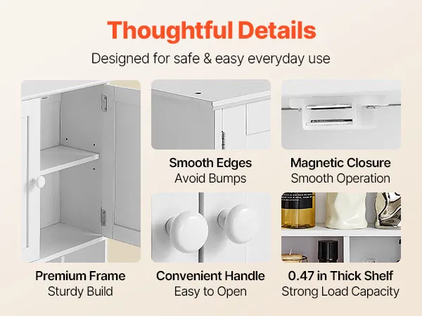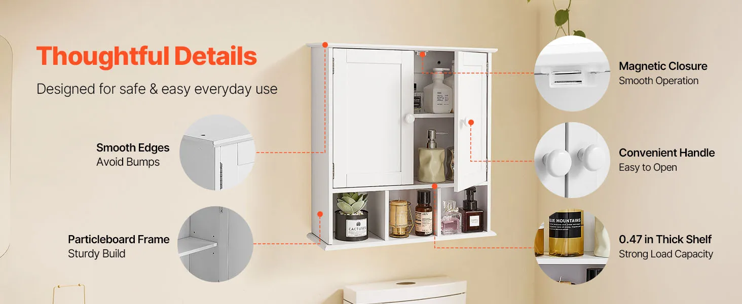 Our wall mounted bathroom cabinet features sturdy and durable particleboard frame with smooth magnetic closure. Convenient handles and smooth edges ease opening and avoid bumps. The 0.6 in thick shelf provides strong load capacity, staying sturdy and attractive long-term.