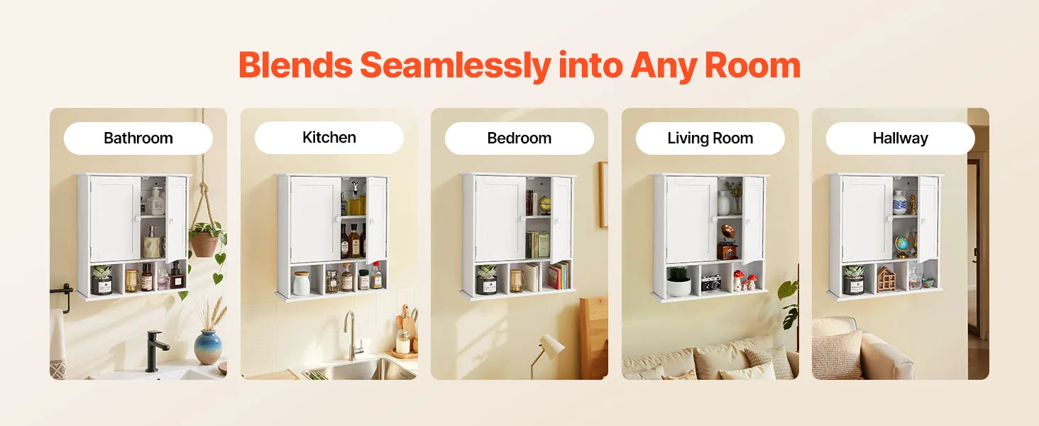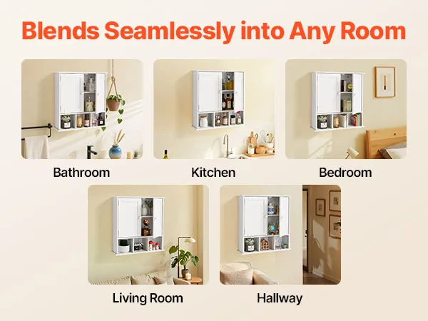 This multi-functional bathroom wall storage cabinet blends seamlessly into bathrooms, kitchens, bedrooms, living rooms, hallways and other living spaces. It flexibly adapts to storing toiletries, kitchen odds, organizing bedroom clutter or decorating living room walls.