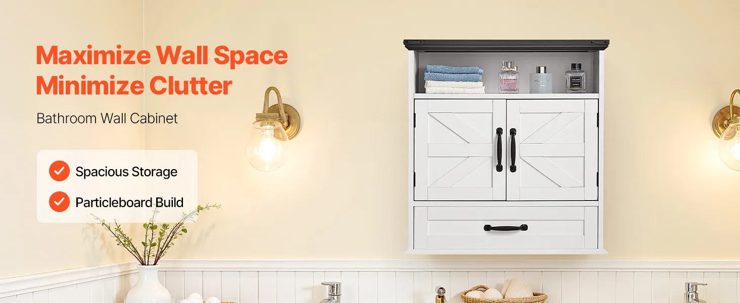 VEVOR Настенный шкаф для ванной с 2 дверцами, регулируемой полкой, ящиком и открытой полкой, белый, экономия места