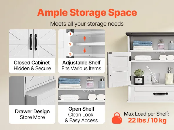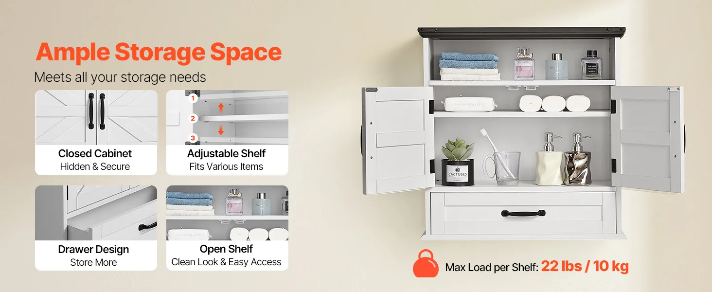 • Adjustable Shelf: The wall mounted bathroom cabinet features an adjustable shelf with 3 height levels, designed to freely adapt to items of different heights. Flexible layout meets diverse storage needs, maximizing bathroom space utilization