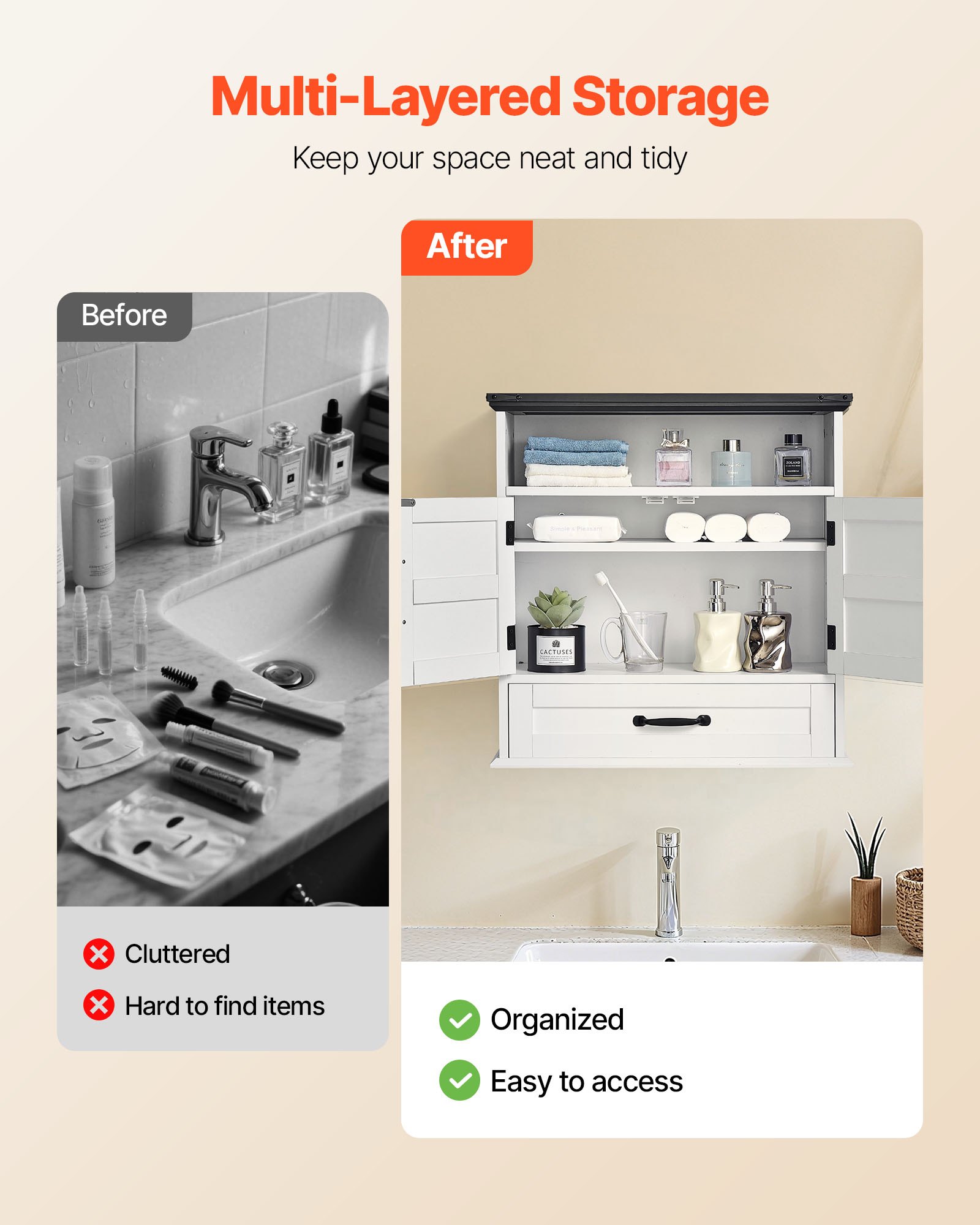 VEVOR Настенный шкаф для ванной с 2 дверцами, регулируемой полкой, ящиком и открытой полкой, белый, экономия места