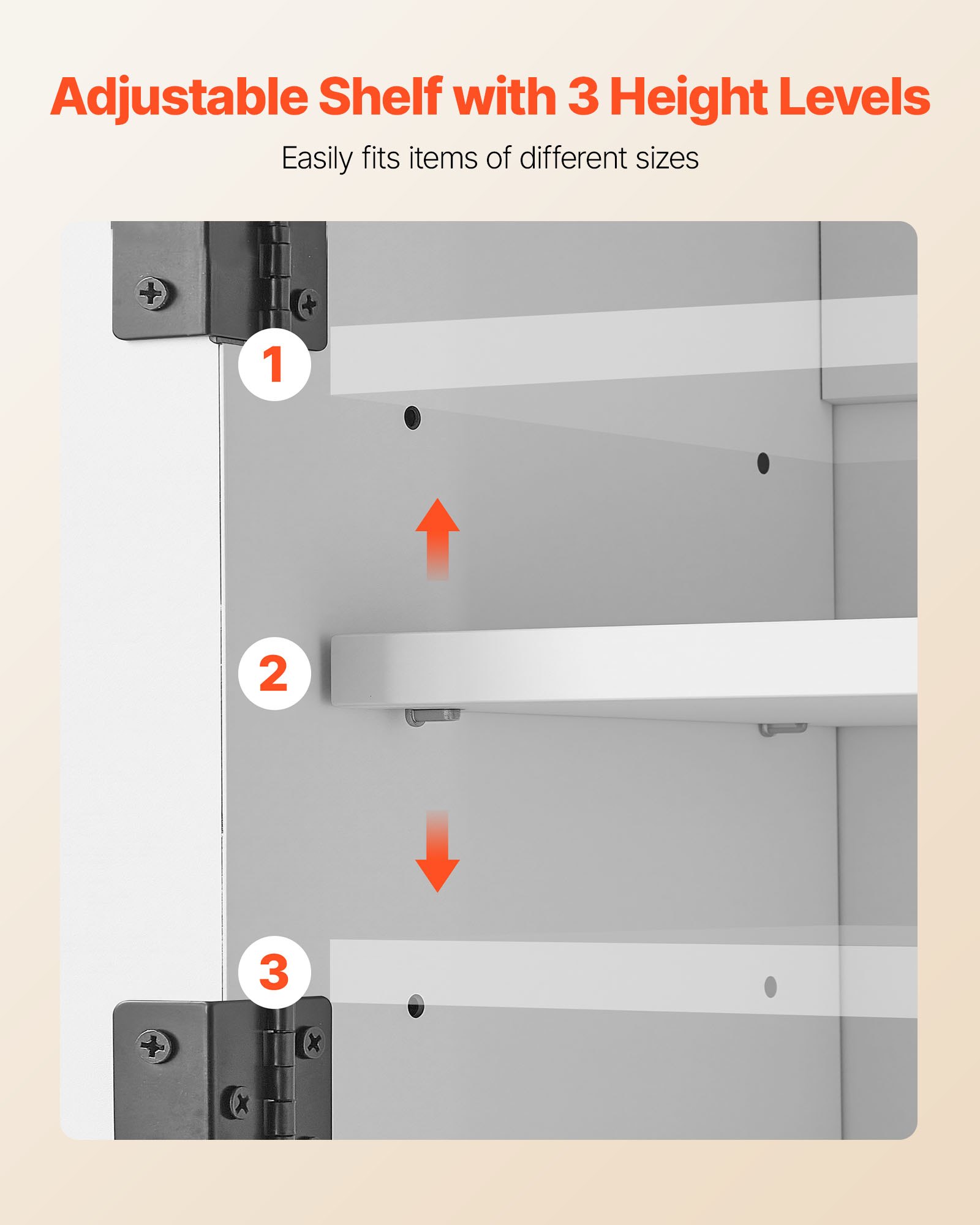 • Adjustable Shelf: The wall mounted bathroom cabinet features an adjustable shelf with 3 height levels, designed to freely adapt to items of different heights. Flexible layout meets diverse storage needs, maximizing bathroom space utilization