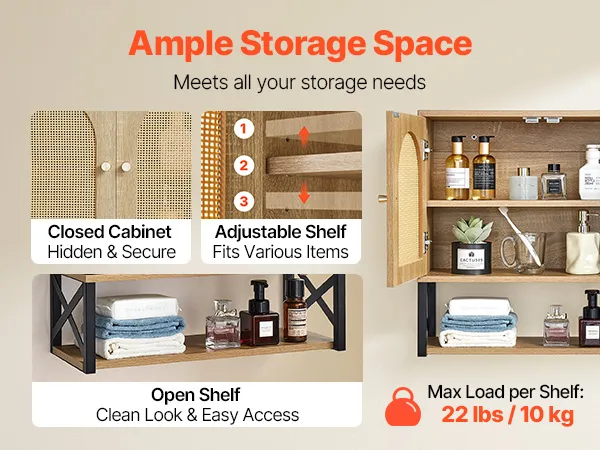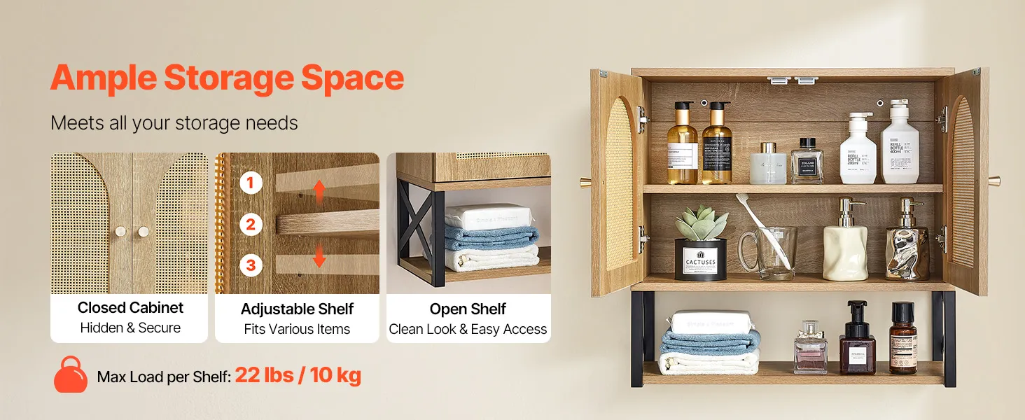 The enclosed cabinet provides hidden, secure storage for items. The hanging bathroom cabinet’s adjustable shelf can flexibly adapt to various types of items and the open shelf is neat and beautiful to access daily items. It is sturdy and durable.