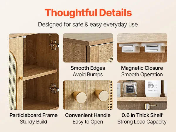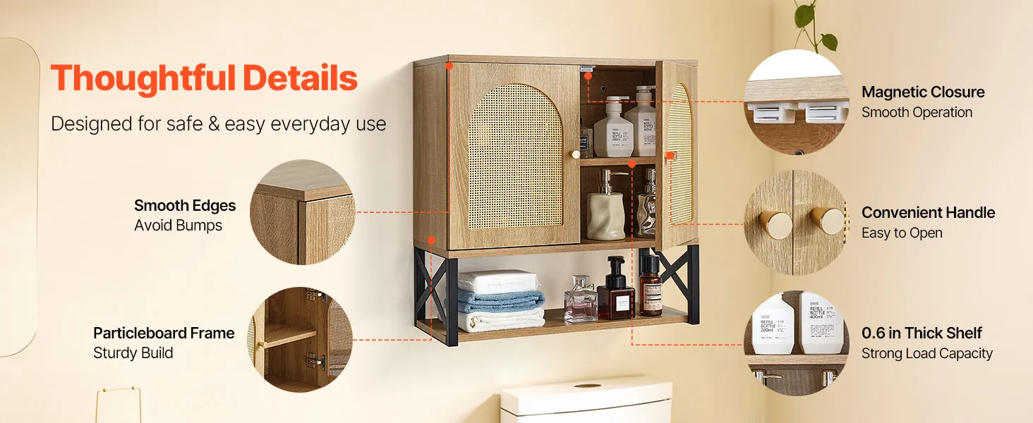 Our wall mounted bathroom cabinet features sturdy and durable particleboard frame with smooth magnetic closure. Convenient handles and smooth edges ease opening and avoid bumps. The 0.6 in thick shelf provides strong load capacity, staying sturdy and attractive long-term.