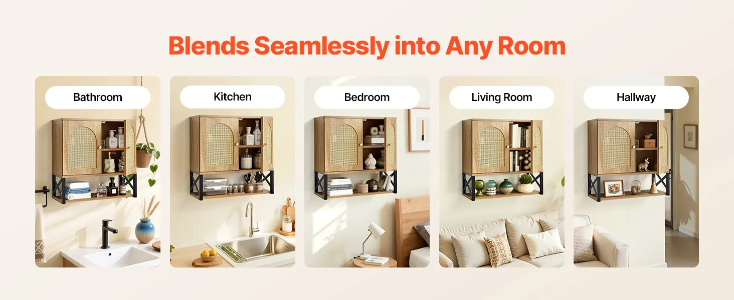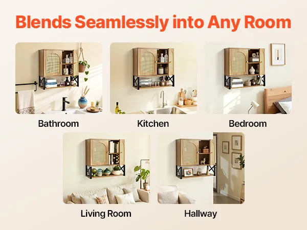 This multi-functional bathroom wall storage cabinet blends seamlessly into bathrooms, kitchens, bedrooms, living rooms, hallways and other living spaces. It flexibly adapts to storing toiletries, kitchen odds, organizing bedroom clutter or decorating living room walls.