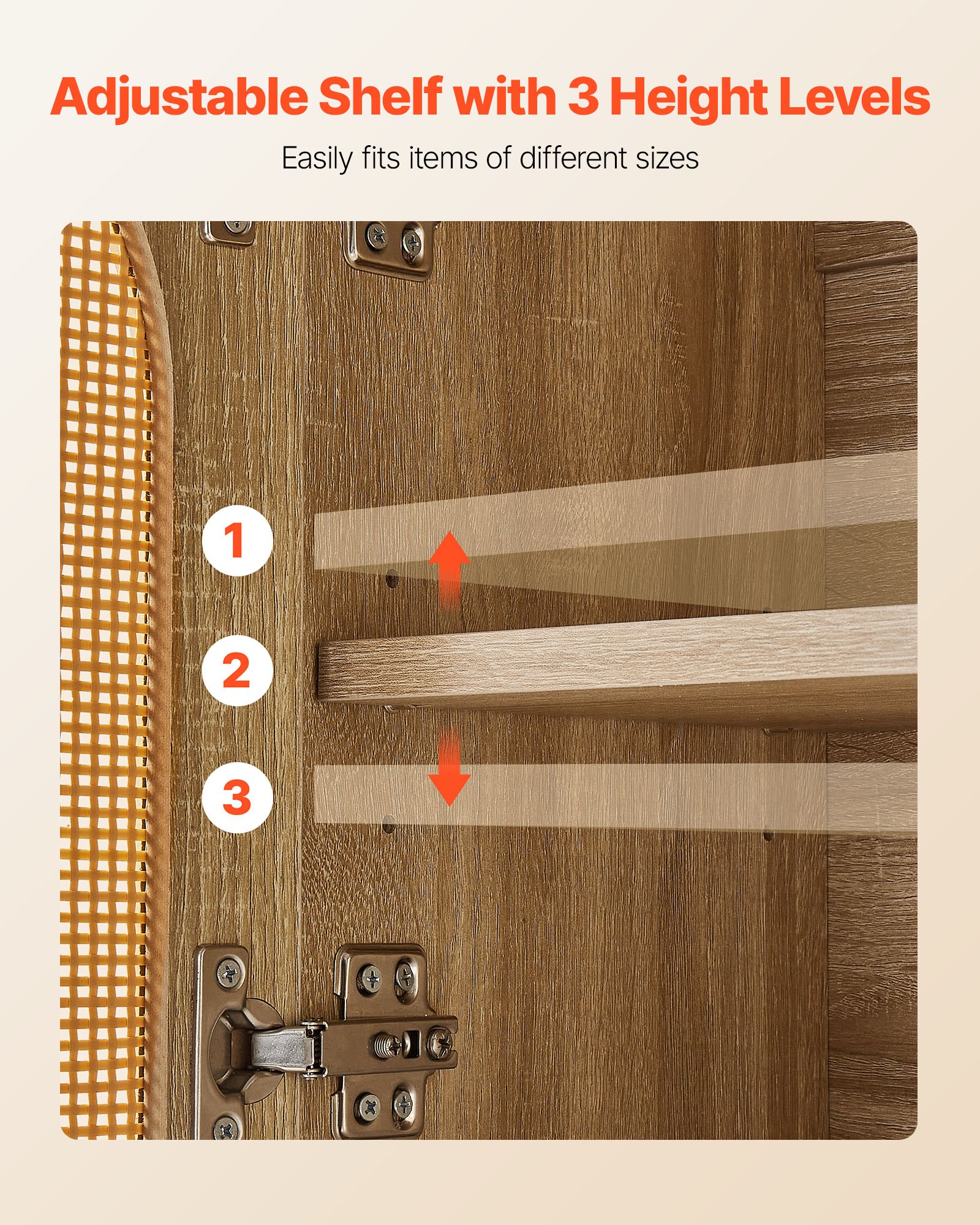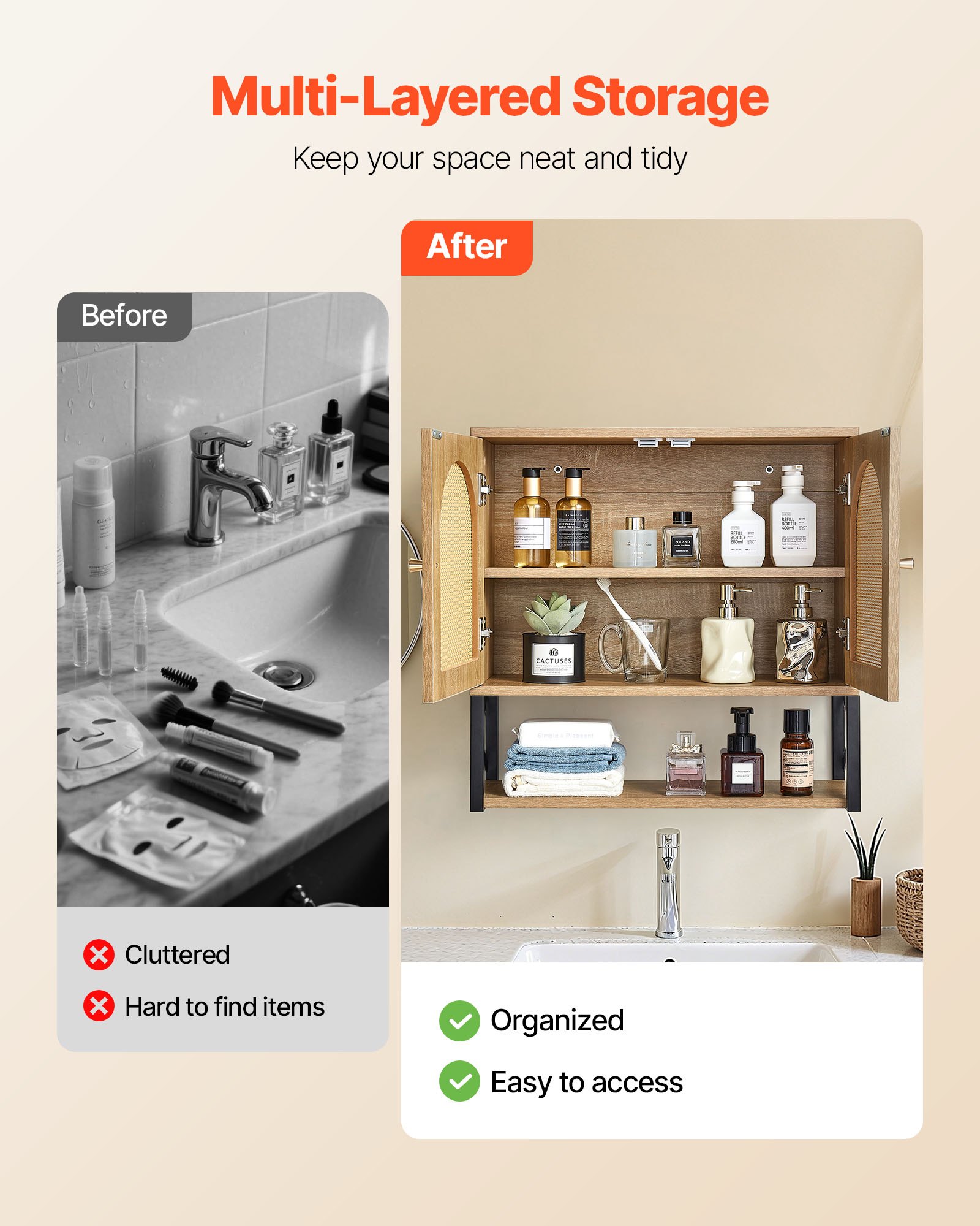 This bathroom wall cabinet features premium particleboard, sturdy, durable, and appealing. Its spacious interior with 3-level adjustable shelf maximizes vertical storage. Our bathroom wall cabinet meets the storage needs of various toiletries and miscellaneous items.