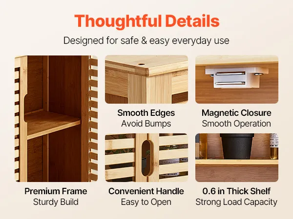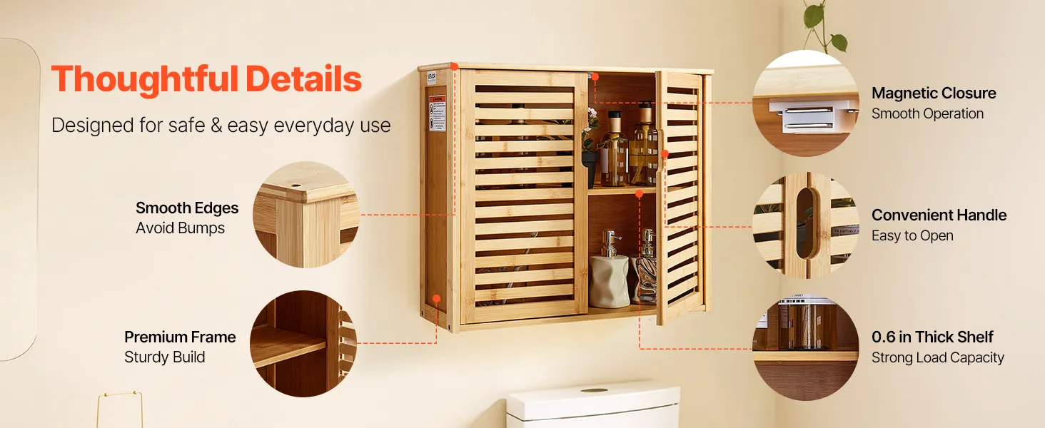 Our wall mounted bathroom cabinet features sturdy and durable frame with smooth magnetic closure. Convenient handles and smooth edges ease opening and avoid bumps. The 0.6 in thick shelf provides strong load capacity, staying sturdy and attractive long-term.
