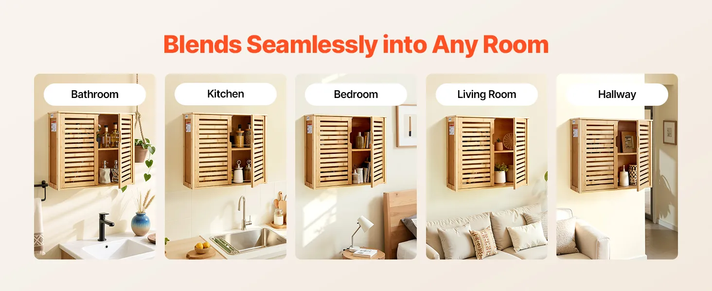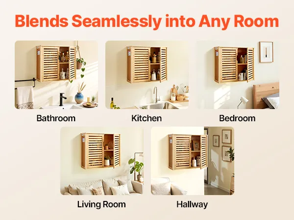 This multi-functional bathroom wall storage cabinet blends seamlessly into bathrooms, kitchens, bedrooms, living rooms, hallways and other living spaces. It flexibly adapts to storing toiletries, kitchen odds, organizing bedroom clutter or decorating living room walls.
