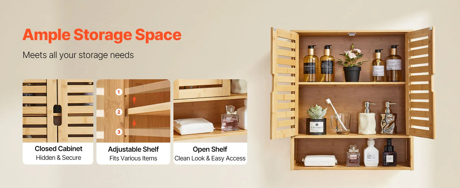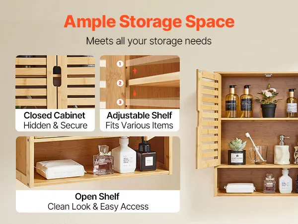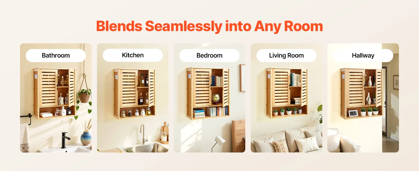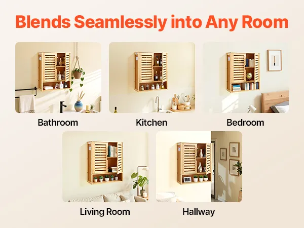 This multi-functional bathroom wall storage cabinet blends seamlessly into bathrooms, kitchens, bedrooms, living rooms, hallways and other living spaces. It flexibly adapts to storing toiletries, kitchen odds, organizing bedroom clutter or decorating living room walls.