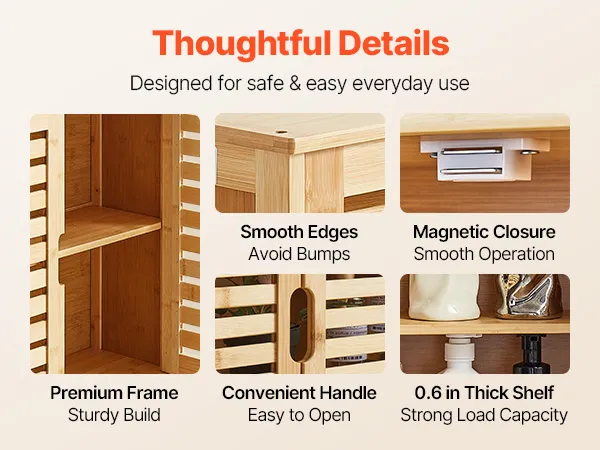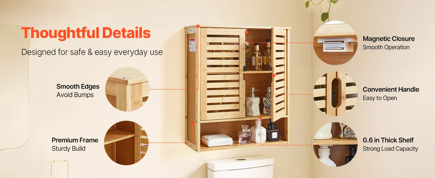 Our wall mounted bathroom cabinet features sturdy and durable frame with smooth magnetic closure. Convenient handles and smooth edges ease opening and avoid bumps. The 0.6 in thick shelf provides strong load capacity, staying sturdy and attractive long-term.