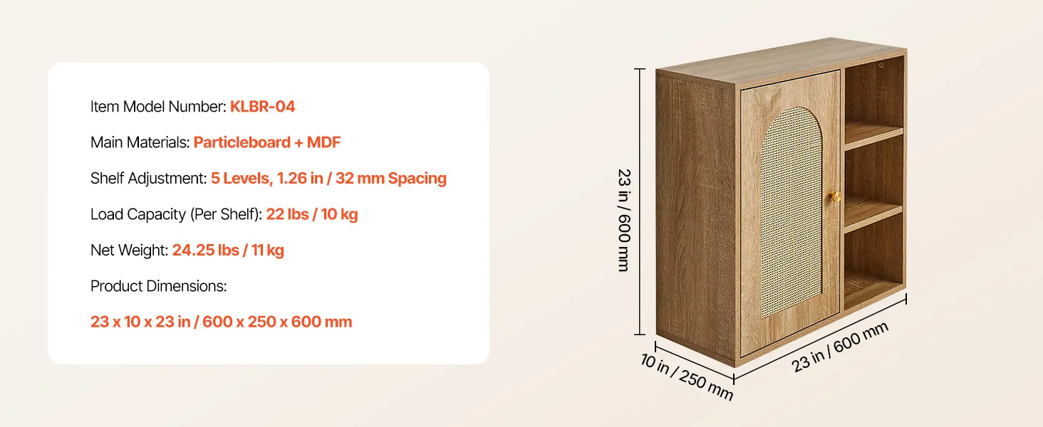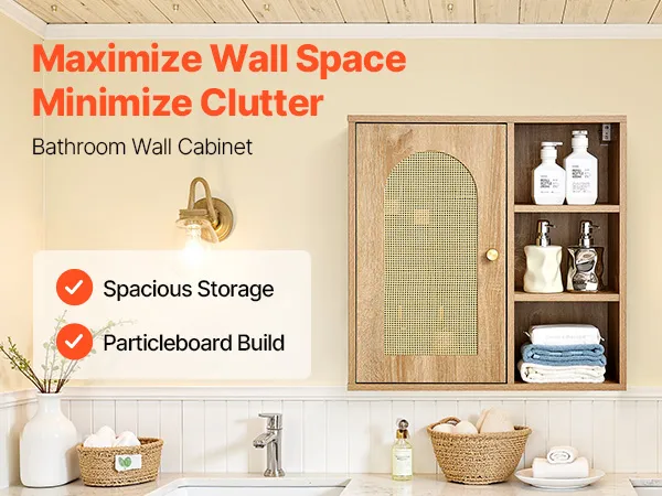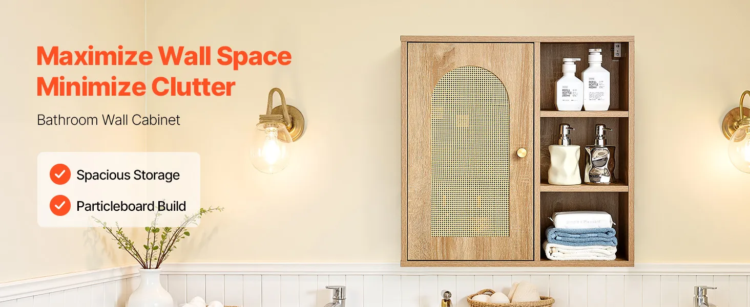 This bathroom wall cabinet features premium particleboard, sturdy, durable, and appealing. Its spacious interior with 5-level adjustable shelf maximizes vertical storage. Our bathroom wall cabinet meets the storage needs of various toiletries and miscellaneous items.