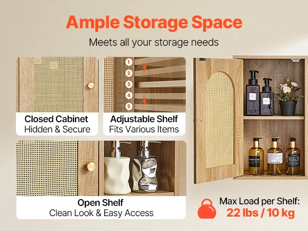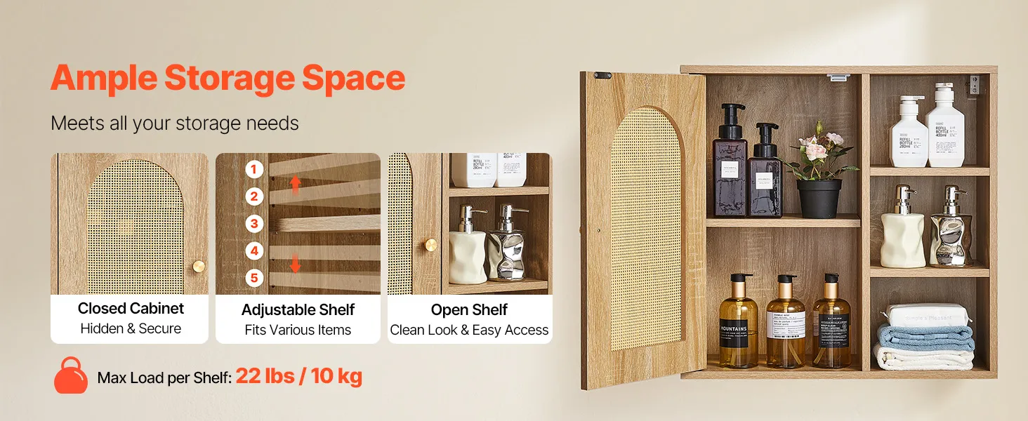 The enclosed cabinet provides hidden, secure storage for items. The hanging bathroom cabinet’s adjustable shelf can flexibly adapt to various types of items and the open shelf is neat and beautiful to access daily items. It is sturdy and durable.