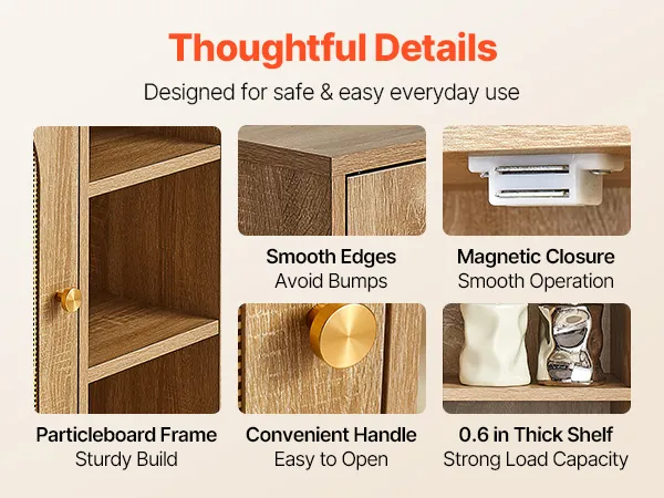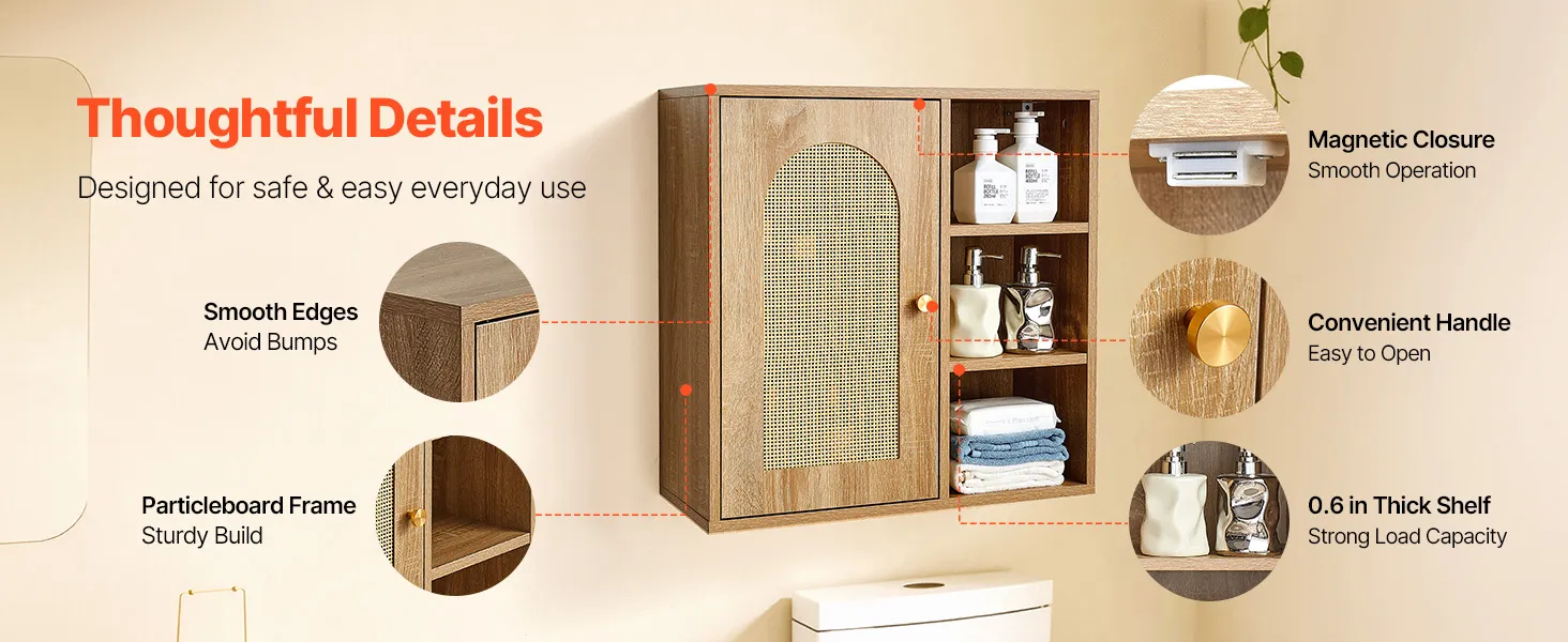 Our wall mounted bathroom cabinet features sturdy and durable particleboard frame with smooth magnetic closure. Convenient handles and smooth edges ease opening and avoid bumps. The 0.6 in thick shelf provides strong load capacity, staying sturdy and attractive long-term.