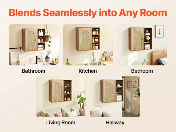 This multi-functional bathroom wall storage cabinet blends seamlessly into bathrooms, kitchens, bedrooms, living rooms, hallways and other living spaces. It flexibly adapts to storing toiletries, kitchen odds, organizing bedroom clutter or decorating living room walls.