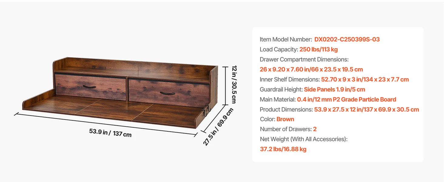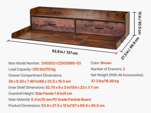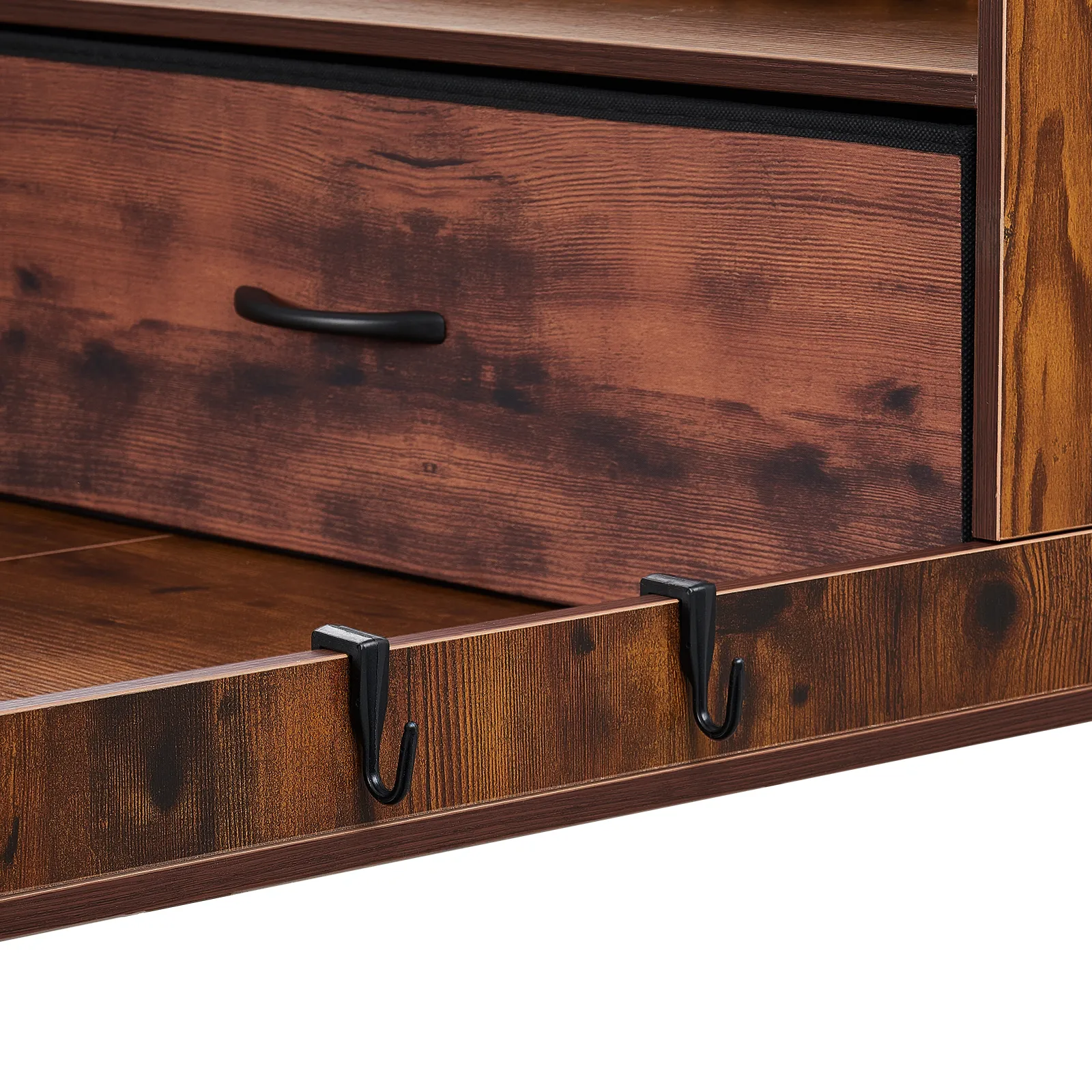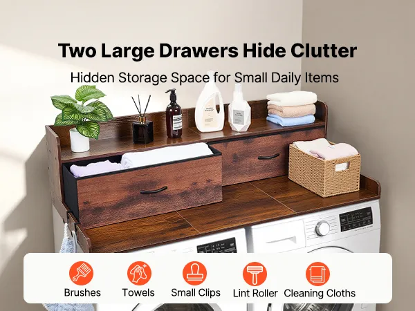VEVOR Washer Dryer Countertop with Shelf, 137 x 69.9 cm Wooden Washer and Dryer Topper with 2 Drawers & Hooks, Laundry Machine Topper for Laundry Closet Pantry Counter Organization and Storage, Brown