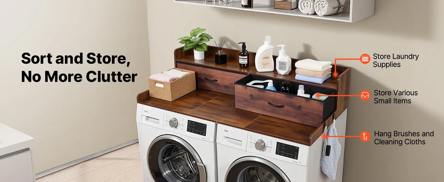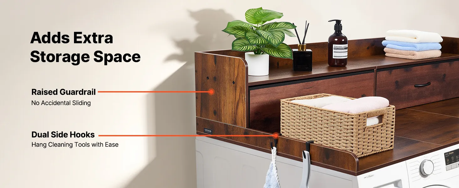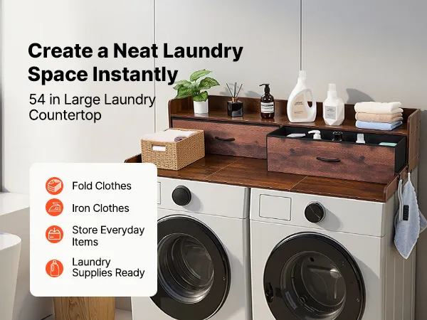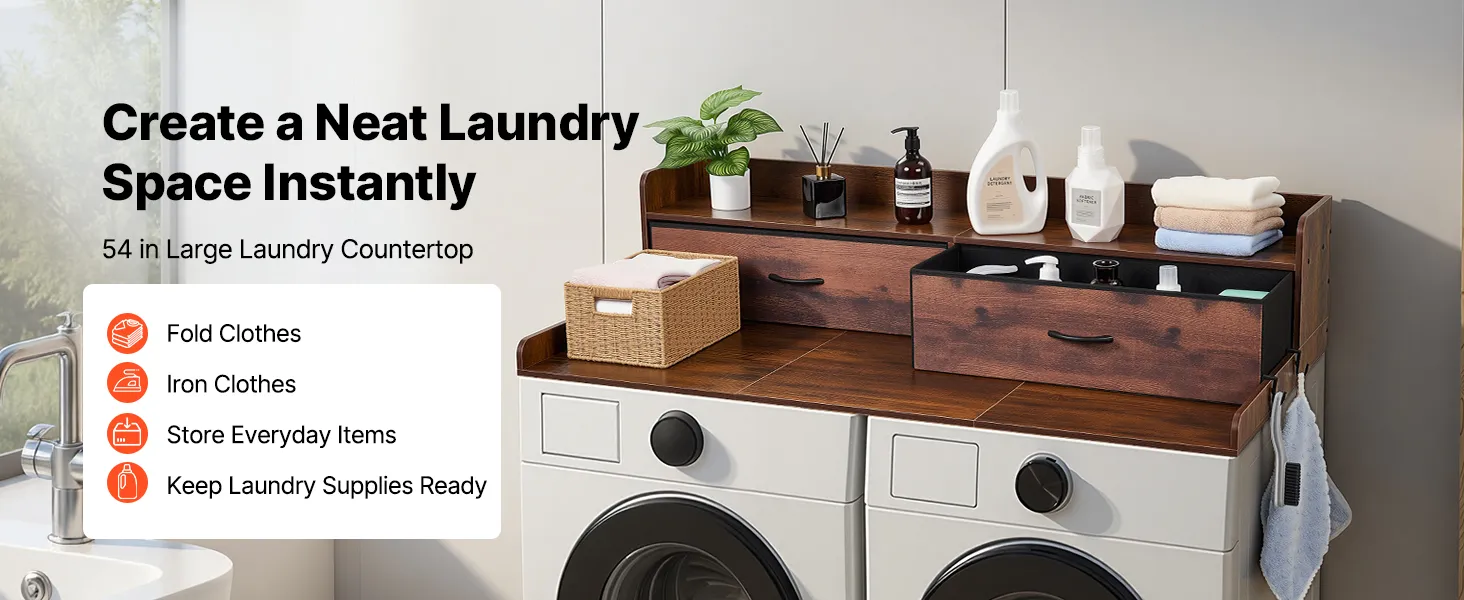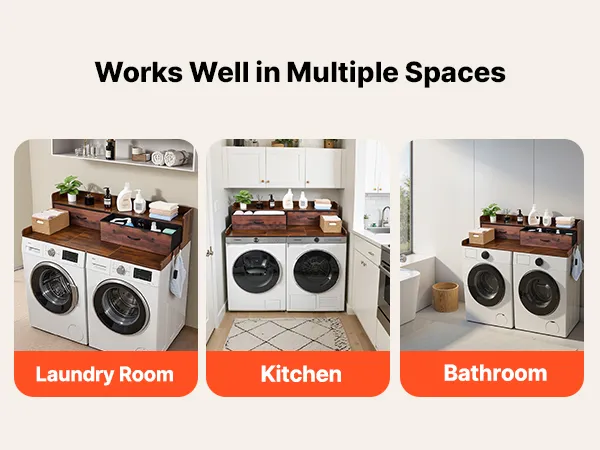 Place this washer dryer countertop above your machines to add extra storage and a work surface for folding clothes, ironing, or keeping laundry supplies within reach.