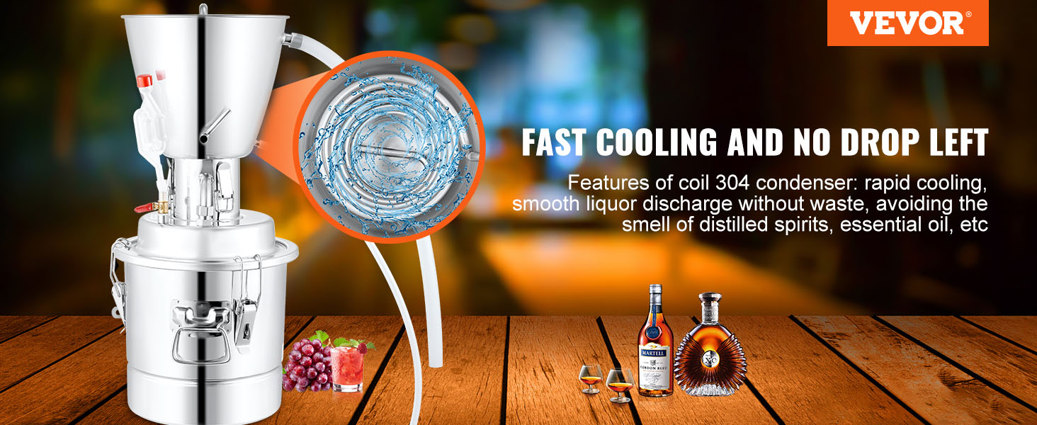 • Обновленный конденсационный резервуар: Конденсация и очистка объединены для исключения загрязнений на уровне головы. Трубка самогонного аппарата по-прежнему гладкая, без морщин, и дистиллированный ликер, вода и эфирное масло не останутся внутри, чтобы избежать размножения грибка. Дистиллированные спиртные напитки, эфирные масла и т.д. Эффективно предотвращают натягивание нитей.