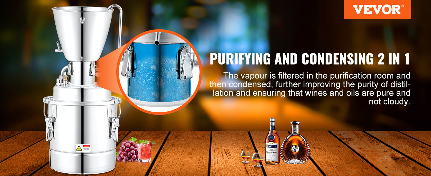 • Профессиональный метод дистилляции: С помощью ряда процедур, таких как выпаривание, очистка, фильтрация и конденсация, вы можете дистиллировать более ароматные и эксклюзивные вина, эфирные масла и т.д. Большая емкость спирта объемом 50 л по-прежнему позволяет перегонять большее количество ингредиентов за один раз.