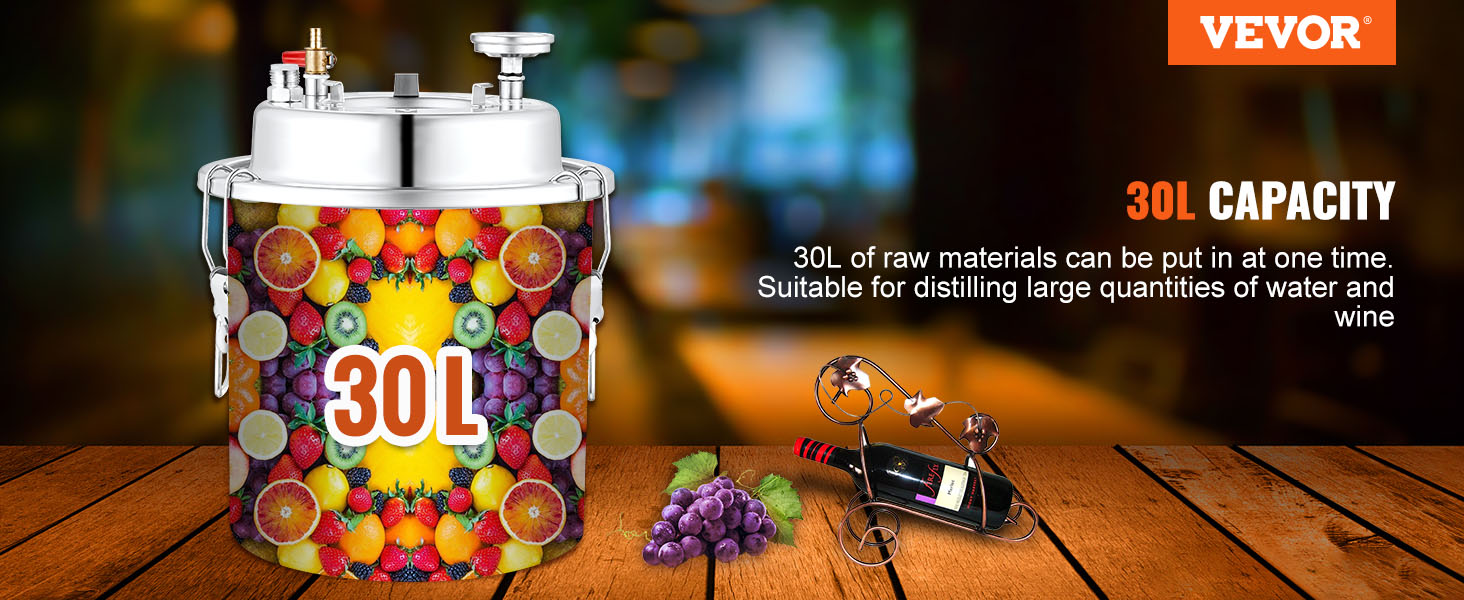 • Универсальное использование: Вы можете производить виски, вино, водку, дистиллированную воду, этанол и эфирное масло, а также ферментировать фрукты, овощи и соевые бобы с помощью нашего спиртового дистиллятора из нержавеющей стали. Утолщенное дно можно разогревать различными способами, включая открытый огонь, индукционную плиту, электрические плиты и т.д.