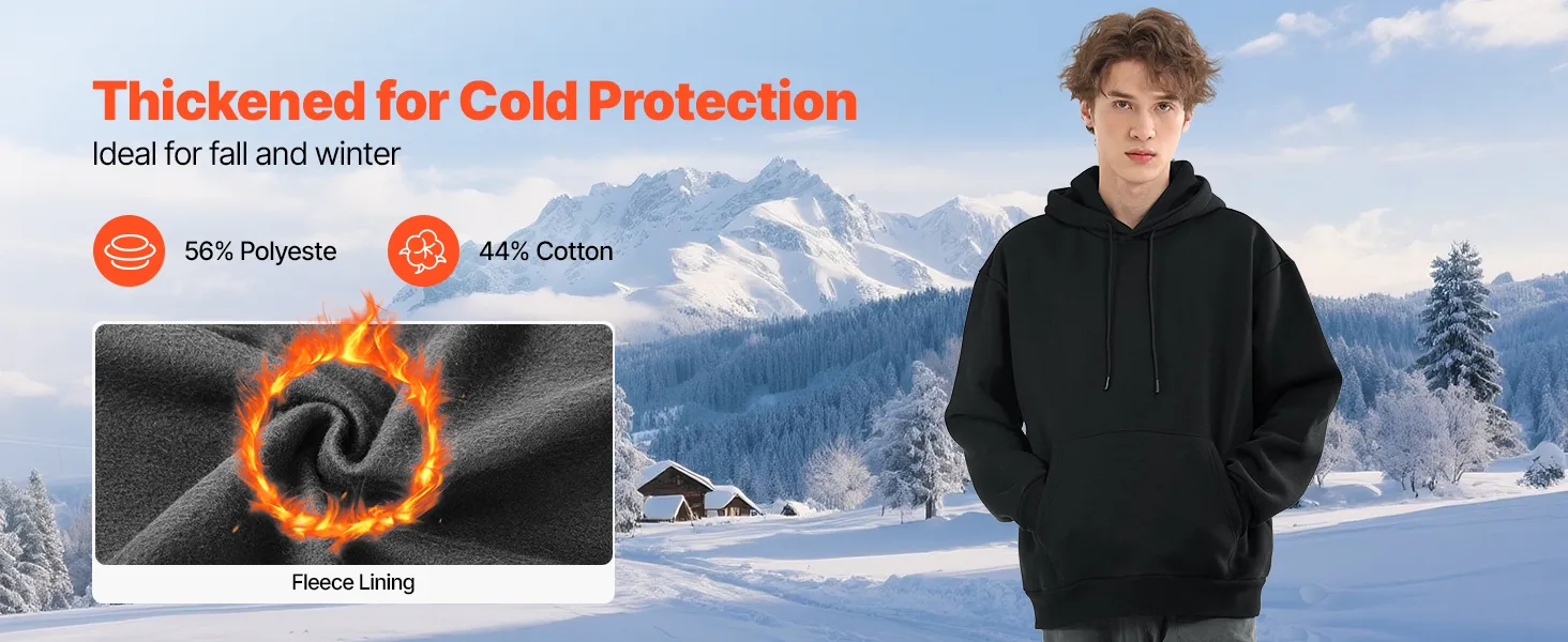 We use a 56% polyester and 44% cotton blend. The fleece lining of the hoodie locks in warmth and feels gentle on the skin—ideal for cool fall and winter days.