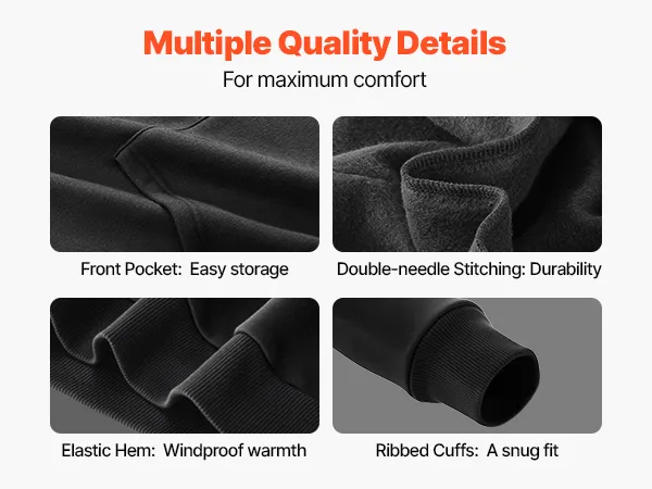 We include a roomy front pocket for small items. Double-stitched seams boost durability, while the elastic cuffs and hem help seal in warmth.