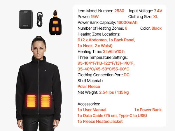 VEVOR Heated Fleece Jacket for Women, Heated Sweatshirt with 7.4V 16000mAh Rechargeable Power Bank Pack, 6 Heating Zones, 3 Temp Levels, 3h/6h/10h Warmth, for Winter Outdoor Camping, Black