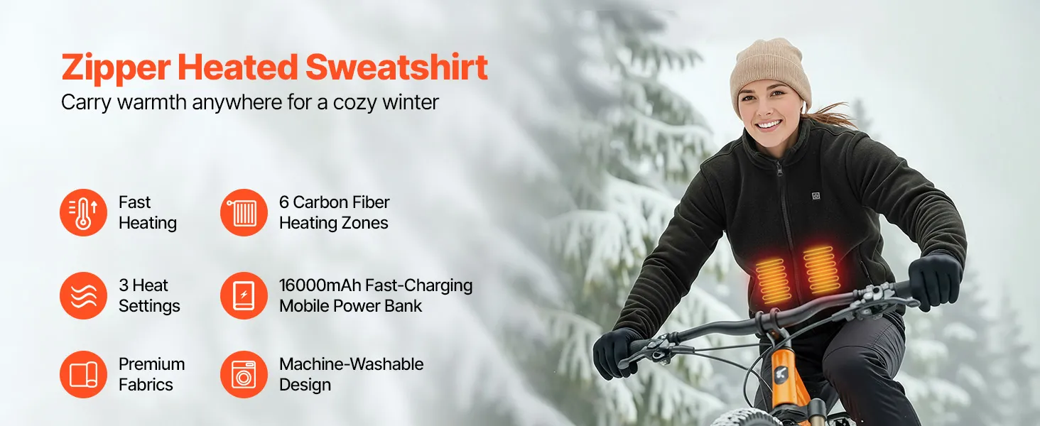 This heated sweatshirt features 6-zone carbon fiber heating for fast, even warmth. It supports three adjustable temperature settings with a 16000 mAh fast-charging power bank. Made of premium fabric, it provides durability and machine-wash convenience for winter wear.