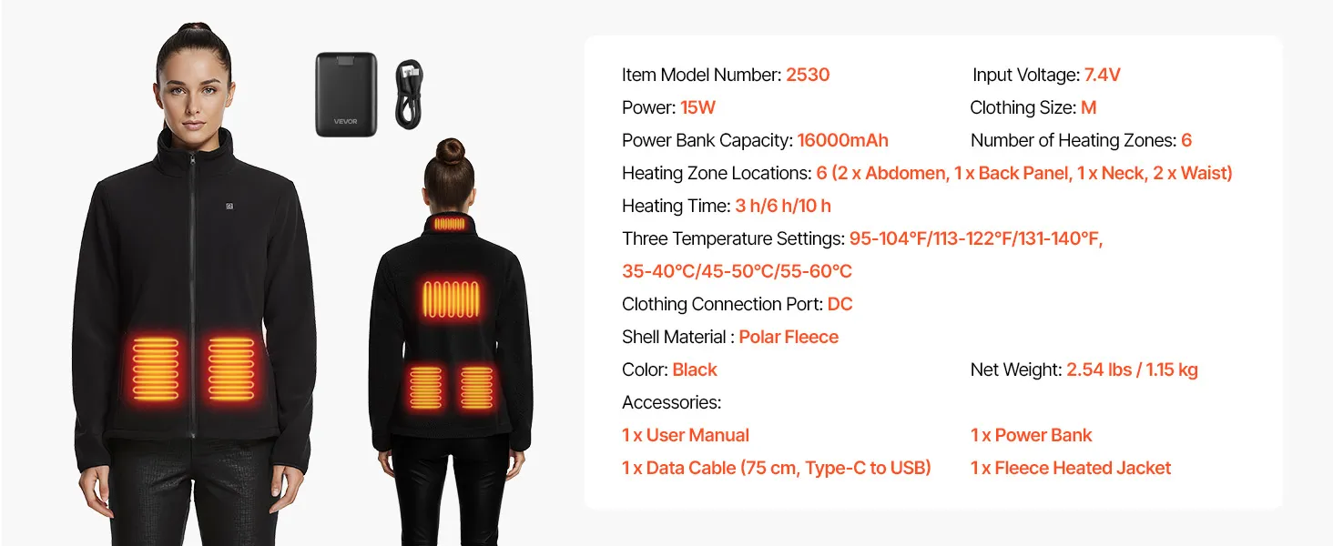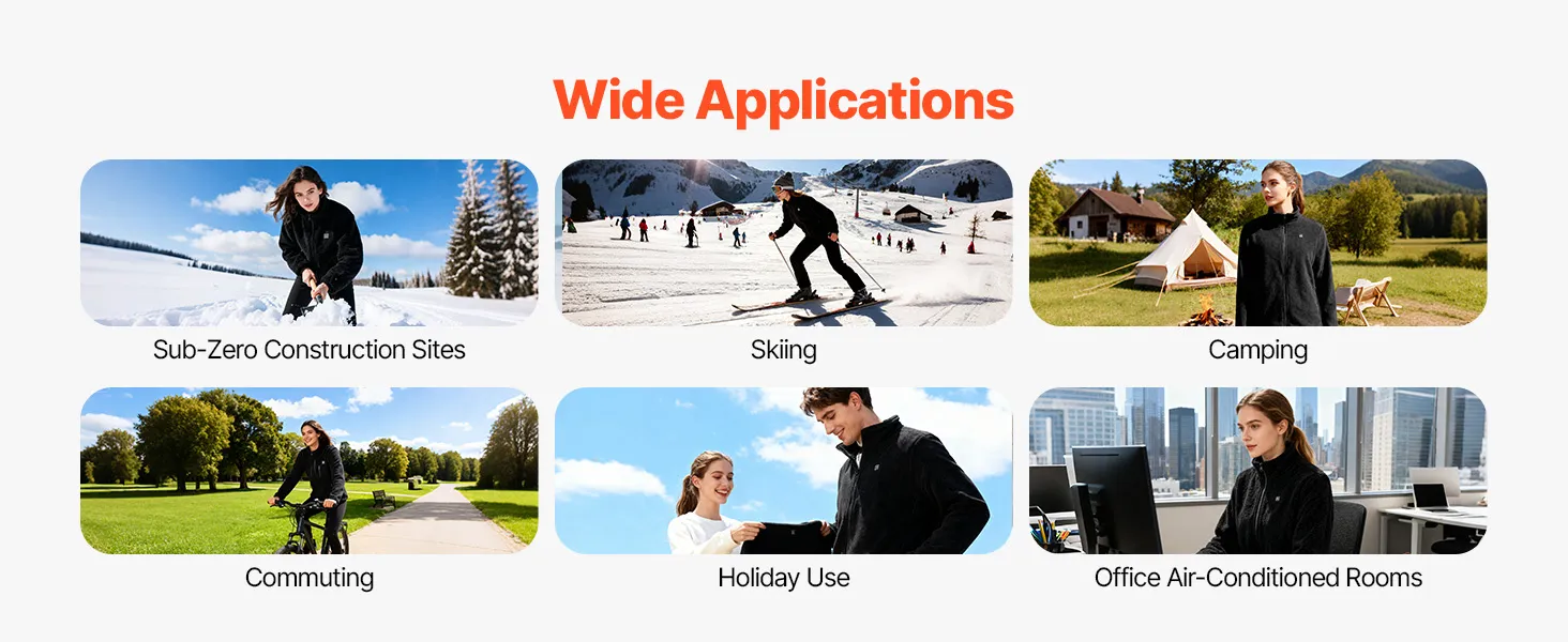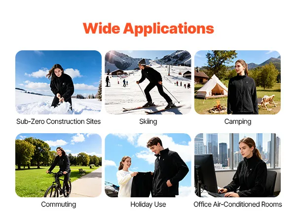 Our heated fleece jacket provides a reliable performance to maintain a constant temperature and warmth anytime, anywhere. It is ideal for outdoor work in severe cold, sports, camping, cycling, commuting, and air-conditioned rooms, also for sharing with family or friends.
