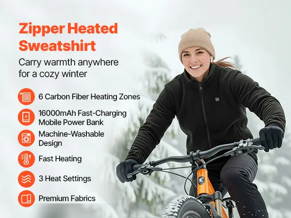 This heated sweatshirt features 6-zone carbon fiber heating for fast, even warmth. It supports three adjustable temperature settings with a 16000 mAh fast-charging power bank. Made of premium fabric, it provides durability and machine-wash convenience for winter wear.